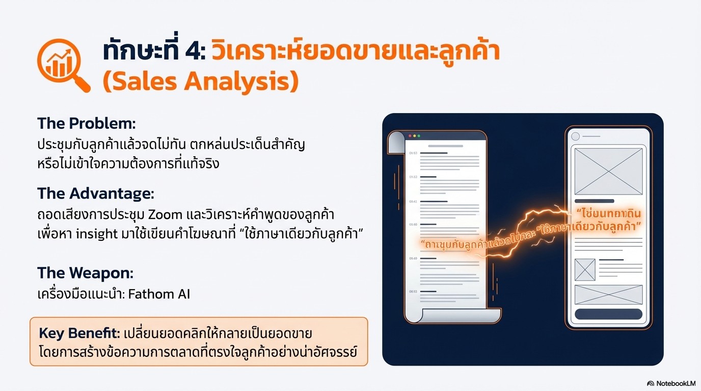 เคล็ดลับคือการใช้ภาษาเดียวกับลูกค้า เมื่อ AI บอกเราได้ว่าลูกค้ามักจะบ่นเรื่องอะไร หรือใช้คำศัพท์ไหนบ่อยๆ เราสามารถหยิบคำเหล่านั้นมาใส่ในพาดหัวโฆษณาของเราได้เลย มันจะทำให้ลูกค้ารู้สึกว่า แบรนด์นี้เข้าใจเขาจริงๆ และนี่คือเทคนิคที่จะเปลี่ยนยอดคลิกให้กลายเป็นยอดขายได้อย่างน่าอัศจรรย์