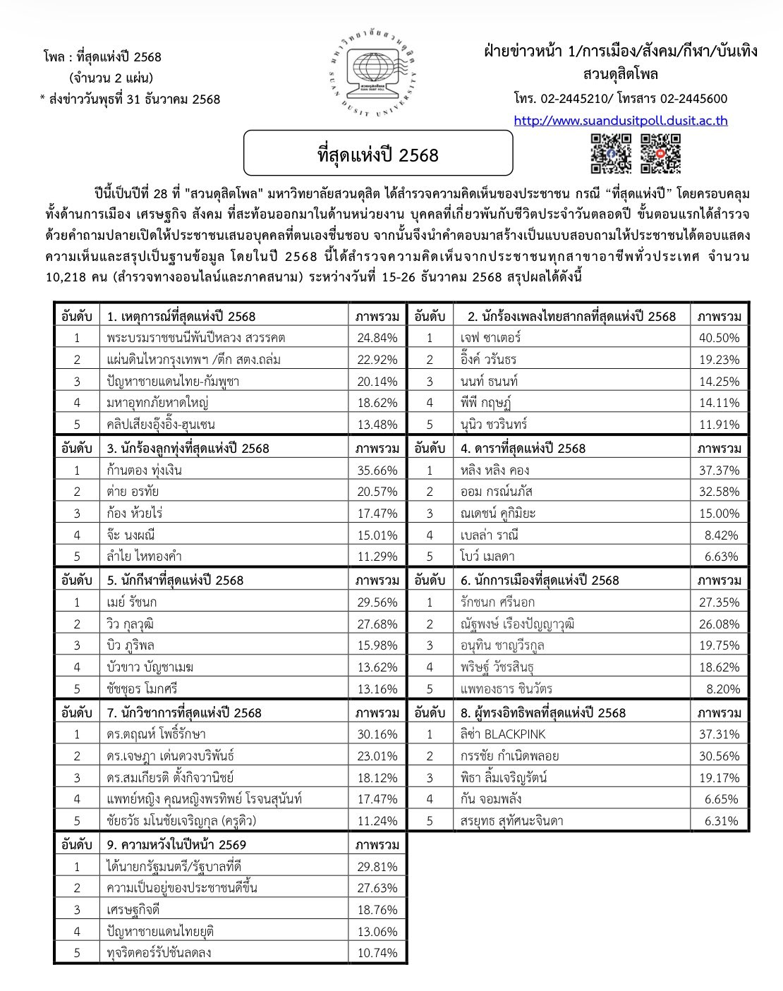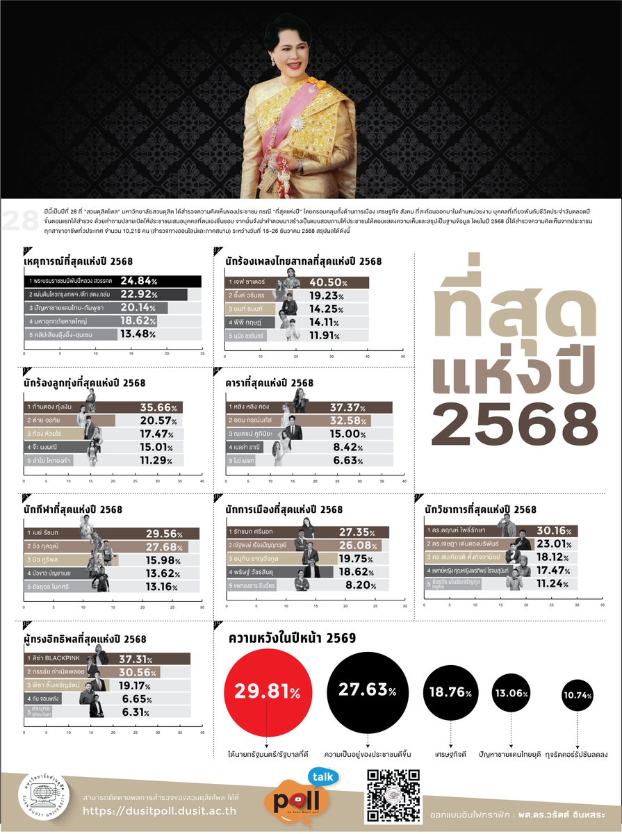 สวนดุสิตโพล “ดาราที่สุดแห่งปี 2568” ช่อง 3 กวาดเรียบ!