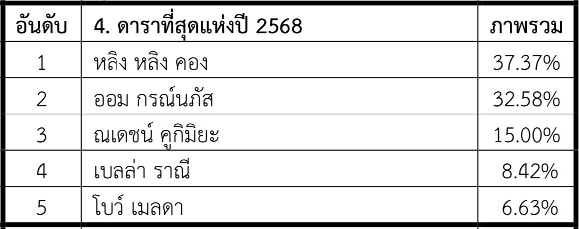 5อันดับ นักแสดงที่สุดแห่งปี 2568 1 หลิงหลิงคอง 37.37% 2 ออมกรณ์นภัส 32.58% 3 ณเดช 15.00% 4 เบลล่า ราณี 8.42% 5 โบว์ เมลดา 6.63%