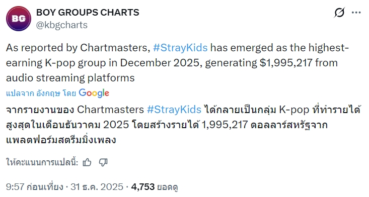 🔥Stray Kids เป็น K-pop อันดับ1 ที่มีรายได้สูงที่สุด 63 ล้านบาทจาก Spotify,Apple Music และ Amazon Music เดือนธันวาคม2025
