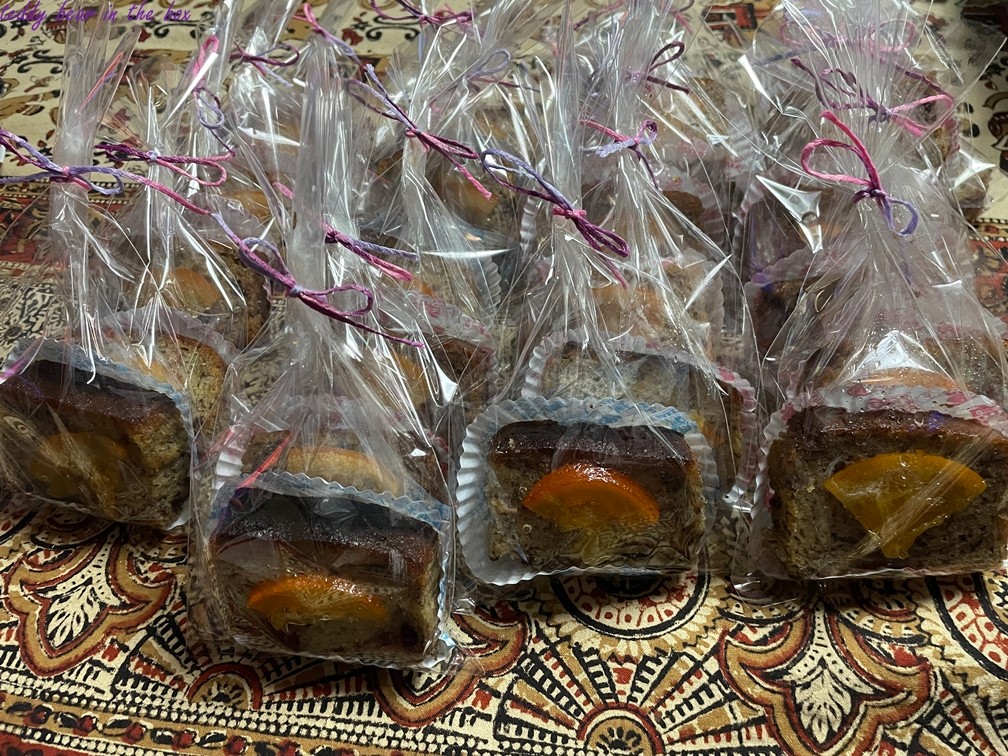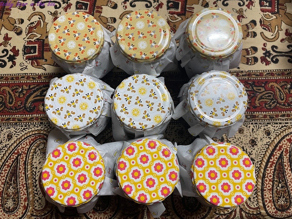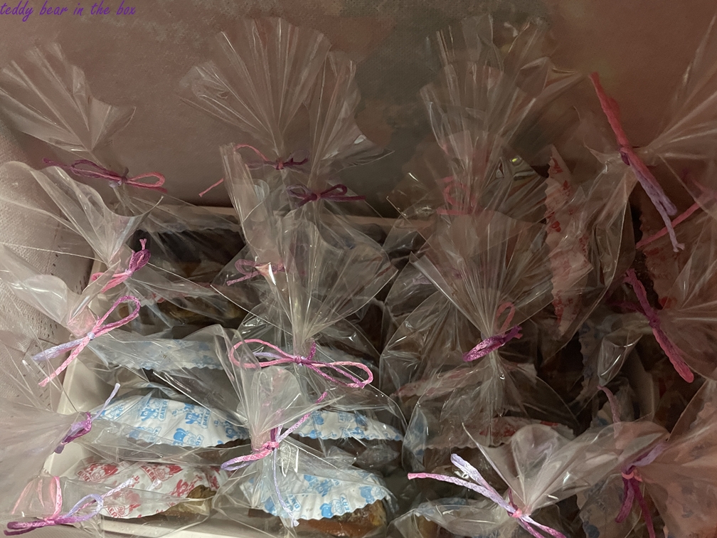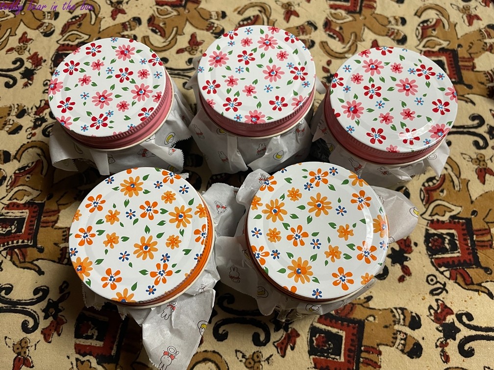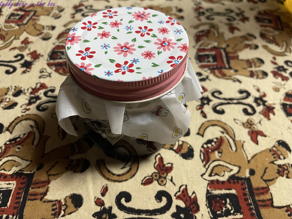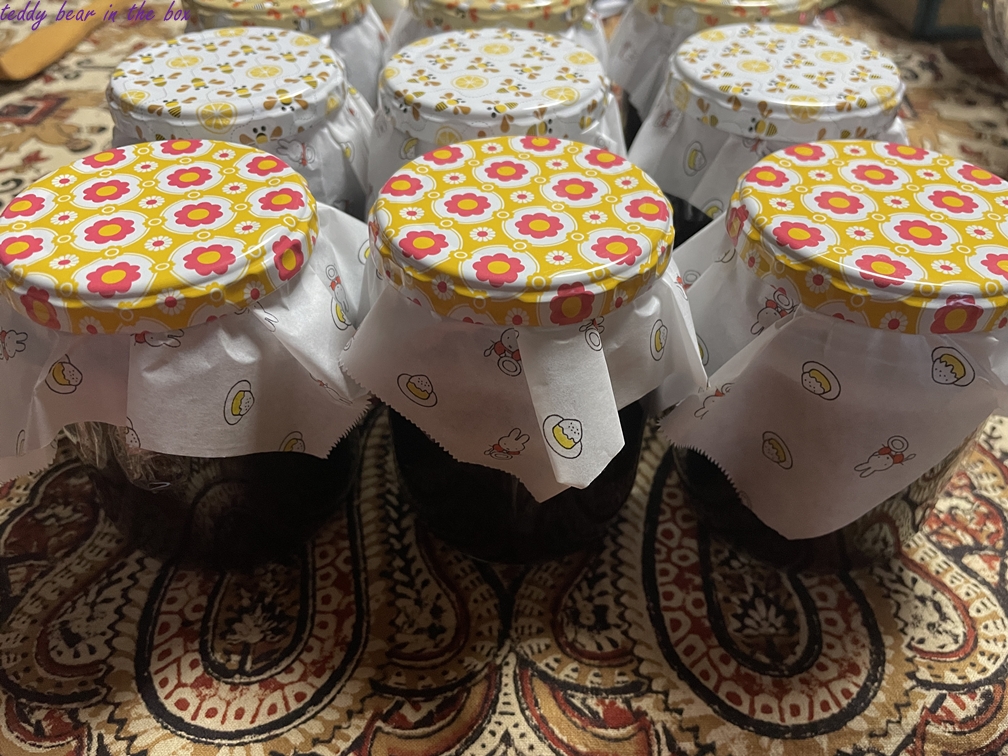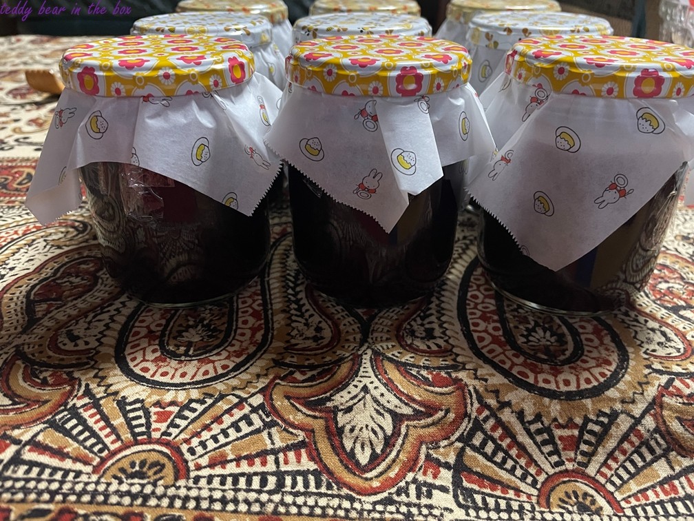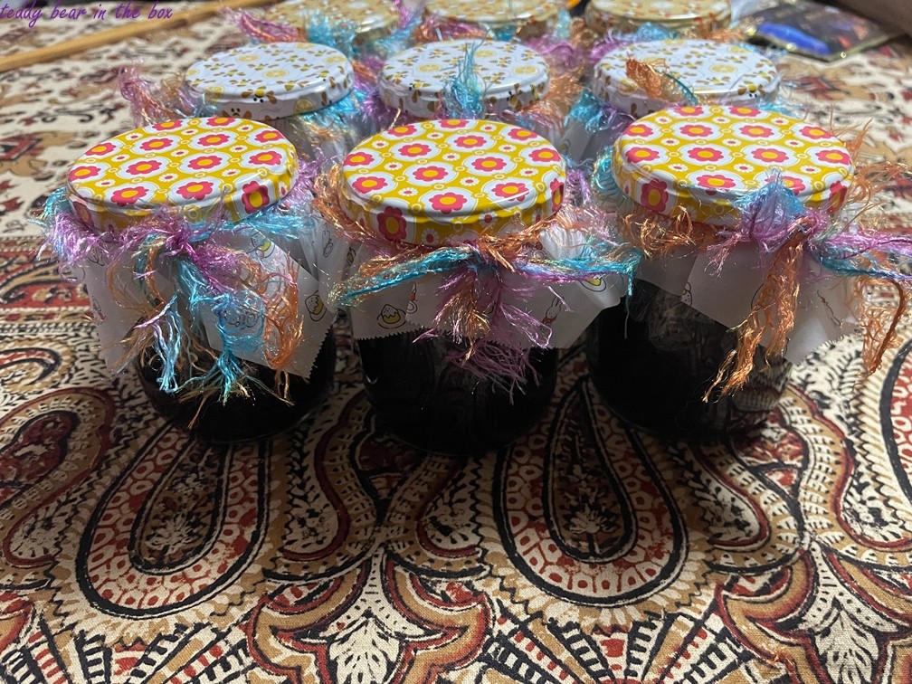 Blueberry Sauce เย็นแล้วตักใส่ขวด แรปพลาสติก ปิดด้วยกระดาษลายน่ารัก ปิดฝา ผูกโบว์ ใส่ถุง