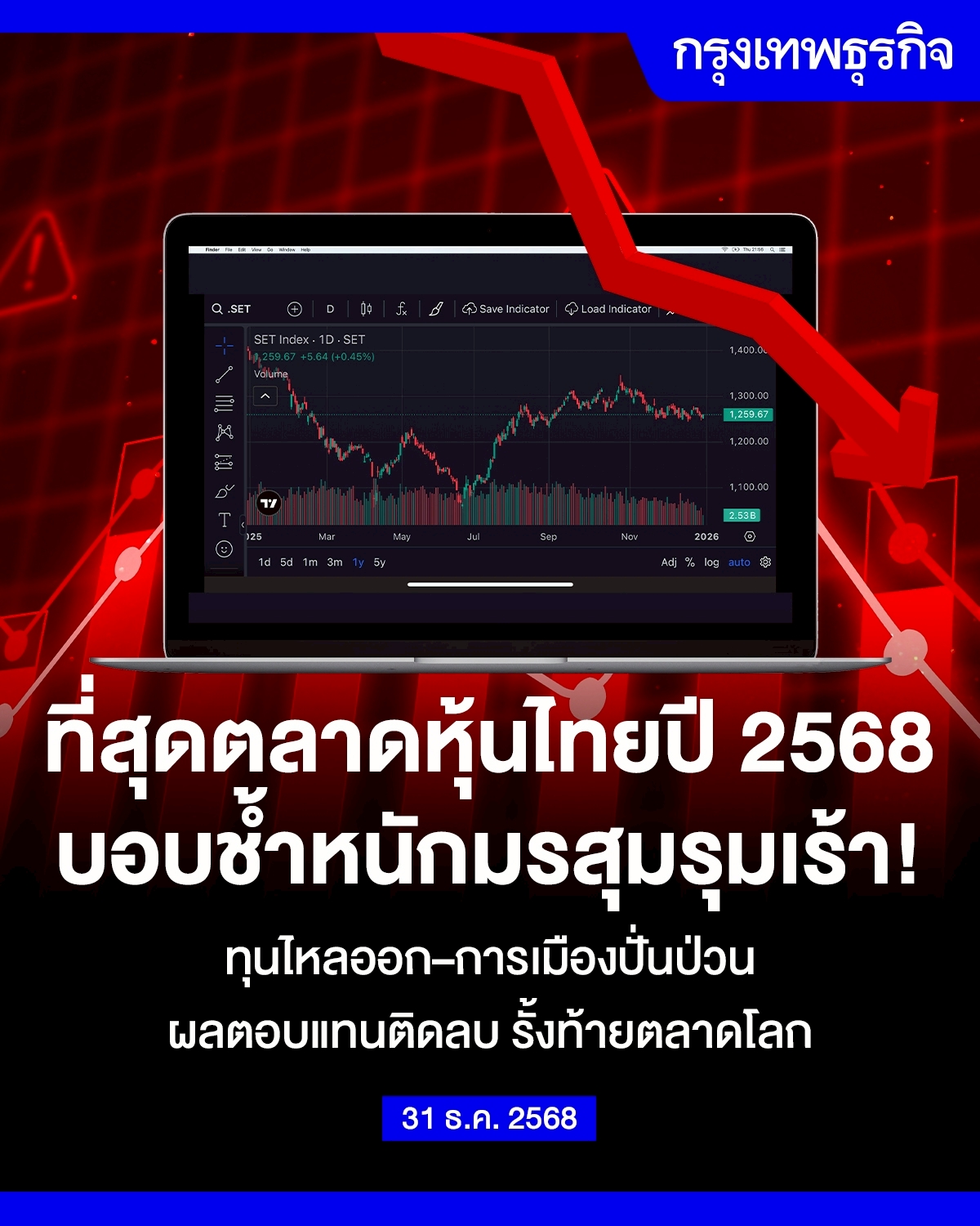 ที่สุดตลาดหุ้นไทยปี 2568 บอบช้ำหนักมรสุมรุมเร้า! ทุนไหลออก–การเมืองปั่นป่วน ผลตอบแทนติดลบ รั้งท้ายตลาดโลก