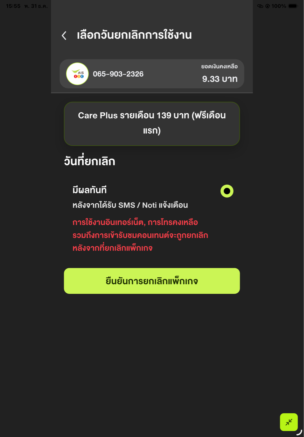 ทำการยกเแพคเก็จนี้ยากจัง แจ้งยกเลิกก่อนเติมเงินไปตั้งนานละ และ AISไม่ยอมยกเลิกให้ พอเติมเงินหักทันที คือ อยากย้ายค่ายมากๆๆเลยค่ะ