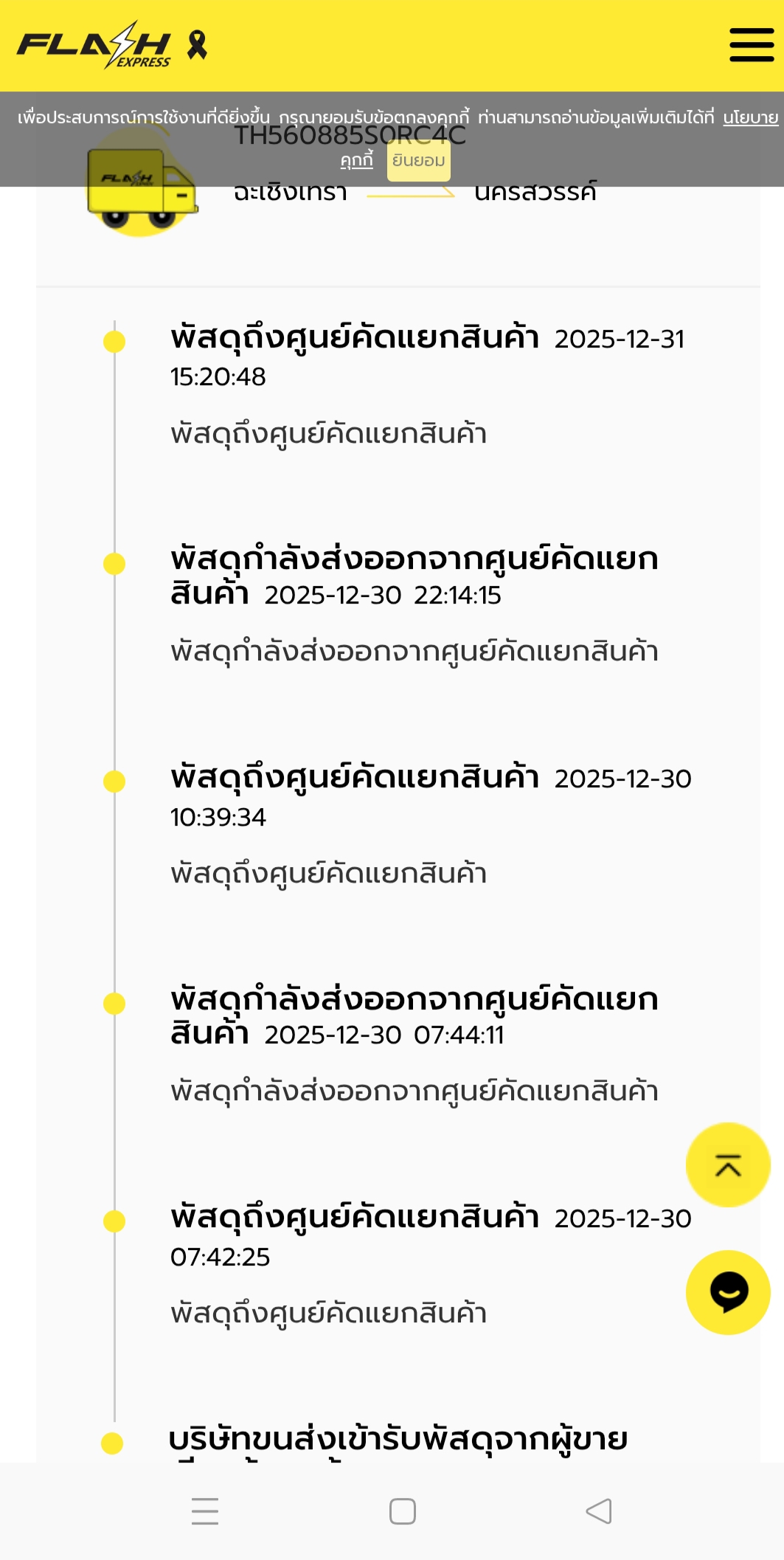 คือขนส่งบอกว่าถึงศูนย์คัดแยกบ้าง กำลังออกจากศูนย์คัดแยกแล้วบ้างมันวนไป 3 รอบโดยไม่ได้บอกว่าเป็นศูนย์ที่จังหวัดไหนแล้วช่องทางติดต่อคือแทบไม่มี จะติดต่อพนักงานก็เป็นร้อยคิวรอจนตายแหละกว่าจะได้ถาม เอไอของ flash ก็ตอบไม่ตรงคำถาม