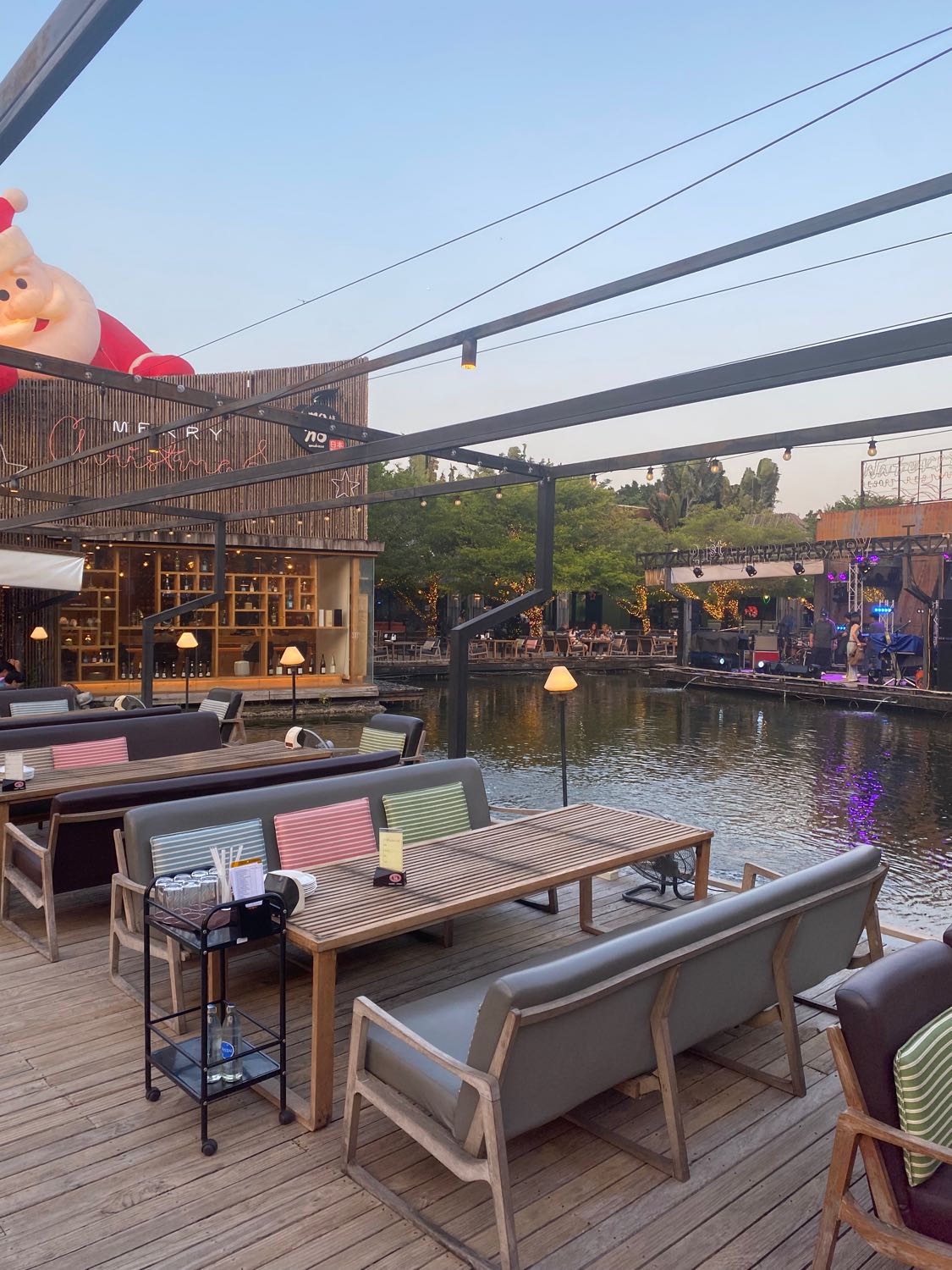 ต้องบอกว่าที่นี่บรรยากาศยืนหนึ่งจริงๆ ครับ สมชื่อ Waterside เพราะที่นั่งส่วนใหญ่จะอยู่ริมน้ำ ลมพัดเย็นสบาย ยิ่งช่วงสิ้นปีอากาศดีๆ แบบนี้คือฟินมาก การตกแต่งร้านช่วงเทศกาลคริสต์มาสและปีใหม่คือจัดเต็มมาก มีซานตาคลอสตัวใหญ่ยักษ์บนหลังคา ไฟประดับสวยงาม ทางเดินไม้ตกแต่งด้วยต้นคริสต์มาสและลูกโป่งธีมแดง-ขาว-เงิน เดินเข้ามาคือได้ฟีลเฉลิมฉลองทันที ใครสายถ่ายรูปบอกเลยว่าได้รูปสวยๆ กลับไปเพียบแน่นอนครับ