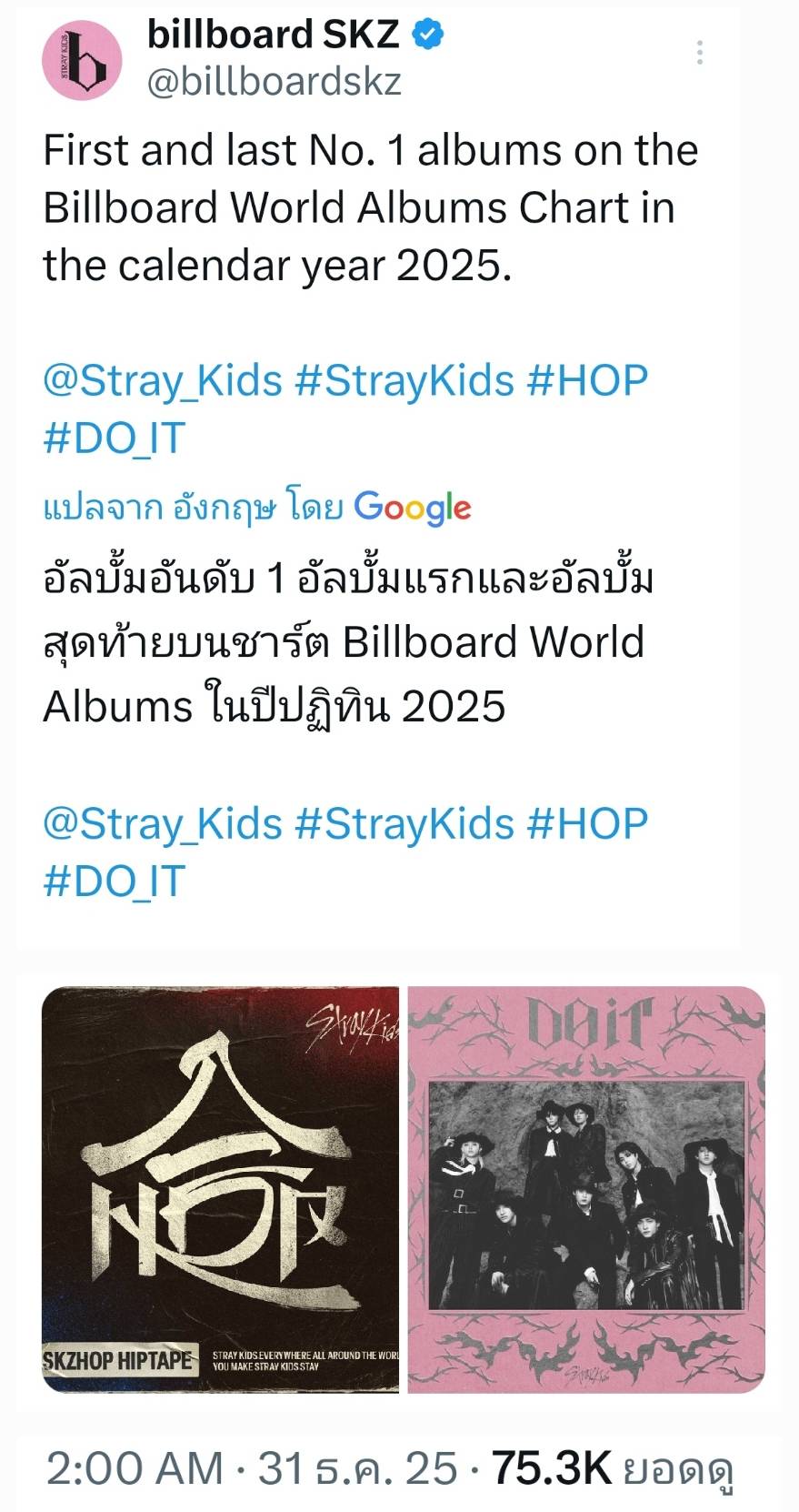 🔥 Stray Kids ทำสิ่งนี้อีก 1 ปี โดยที่ปีที่แล้ว 2024 ก็เคยเกิดขึ้นแล้ว กับอัลบั้มแรกและอัลบั้มสุดท้ายที่ขึ้นอันดับ 1 บน Billboard World Albums Chart 2025