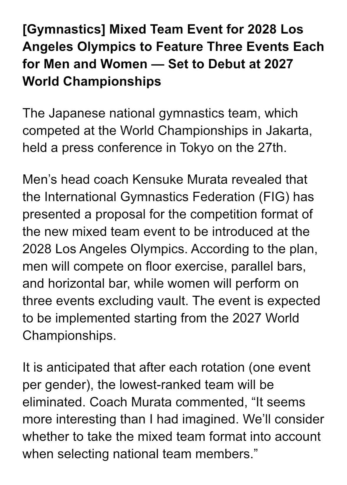 เมื่อวันอาทิตย์ที่ 26 ตุลาคม 2568 ได้มีการประกาศอย่างเป็นทางการออกมาแล้วว่า ในโอลิมปิกปี 2028 ที่กรุง Los Angeles ประเทศสหรัฐอเมริกาจะเป็นเจ้าภาพนั้นจะมีการแข่งขันยิมนาสติกสากลแบบ mixed team หรือแบบทีมผสมชาย-หญิงด้วย ซึ่งการแข่งขันแบบทีมผสม mixed team นั้นจะมีการแข่งในแต่ละอุปกรณ์ฝ่ายละ 3 อย่าง โดยผู้ชายจะแข่งขันในอุปกรณ์ฟลอร์ เอกเซอร์ไซส์, บาร์คู่ และบาร์เดี่ยว ส่วนผู้หญิงก็จะแข่งขัน 3 อุปกรณ์เช่นกัน คือ ฟลอร์ เอกเซอร์ไซส์, บาร์ต่างระดับ และคานทรงตัว (ยกเว้นม้ากระโดดอย่างเดียว)