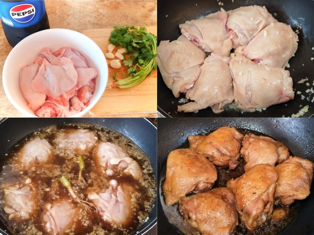 *เคล็ดลับ : หลังจากเทเป๊ปซี่ ให้คว่ำด้านที่เป็นหนังลงกระทะ หนังจะไม่แห้ง สีสวยน่ากิน