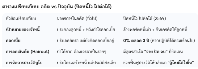 อดีต: มักเป็นการขยายเวลาชำระหนี้ (Debt Rescheduling) แต่ดอกเบี้ยยังเดินต่อ หรือลดดอกเบี้ยลงเพียงเล็กน้อย