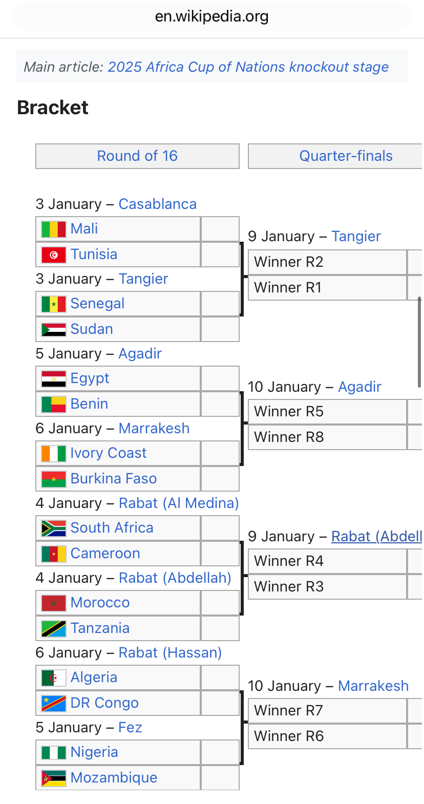 ฟุตบอลแอฟริกันเนชั่นคัพ เดินทางมาถึงรอบ16ทีมแล้ว โดยมีเส้นทางสายการแข่งขันเป็นดังนี้ โดยมีโปรแกรมการแข่งขันรอบ16ทีม คืนวันที่ 27 มกราคม 00:00 แองโกลา - นามิเบีย 03:00 ไนจีเรีย - แคเมอรูน คืนวันที่ 28