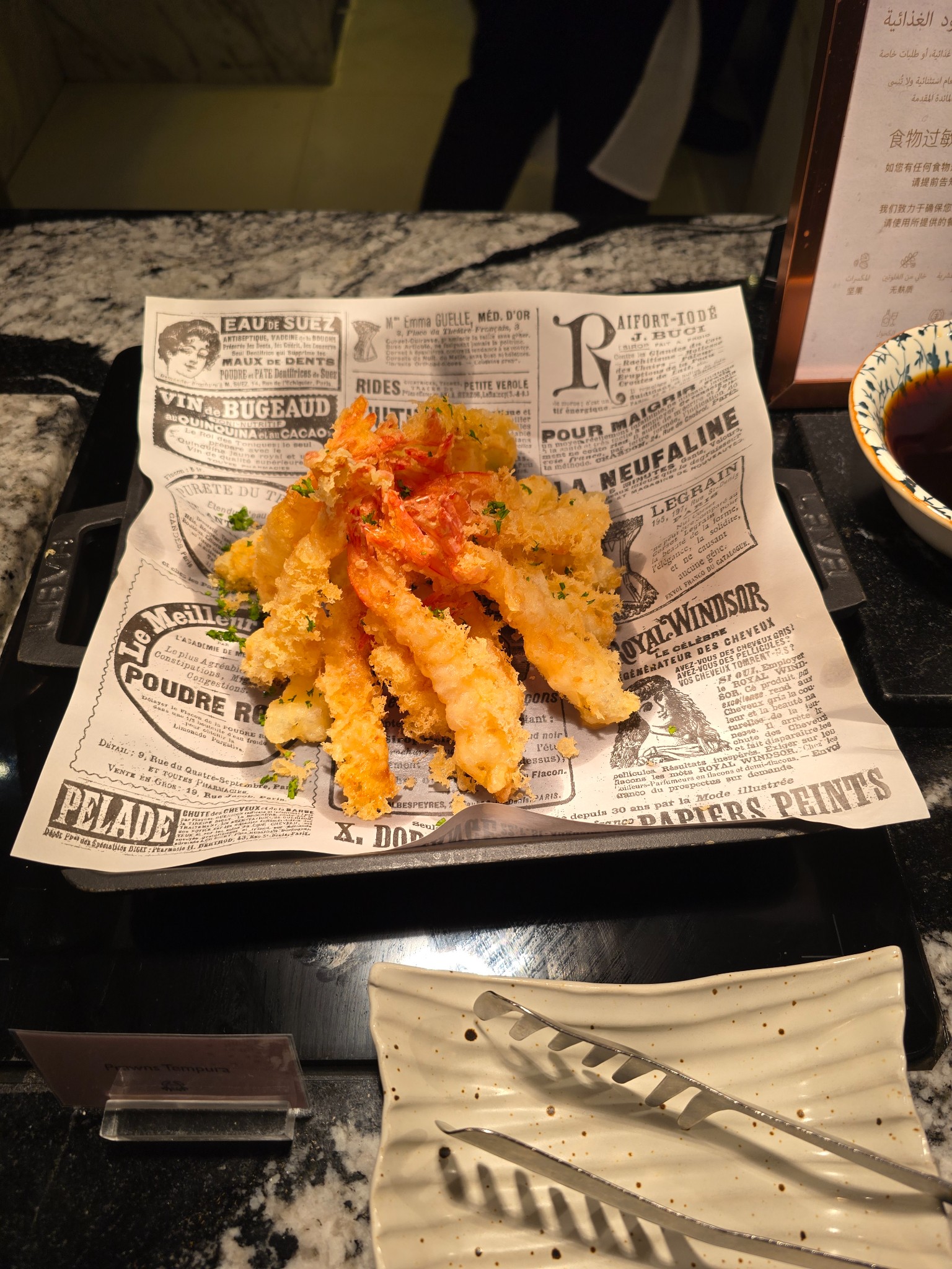 ​มุมญี่ปุ่น (Japanese): ลองซุปข้าว (Umami ดี ข้าวนิ่มกำลังดี) ส่วนกุ้งเทมปุระ แป้งหนาไปหน่อยและไม่กรอบครับ / ซาชิมิ: ท้องแซลมอนและเนื้อแซลมอนสด มันแทรกสวยงามครับ