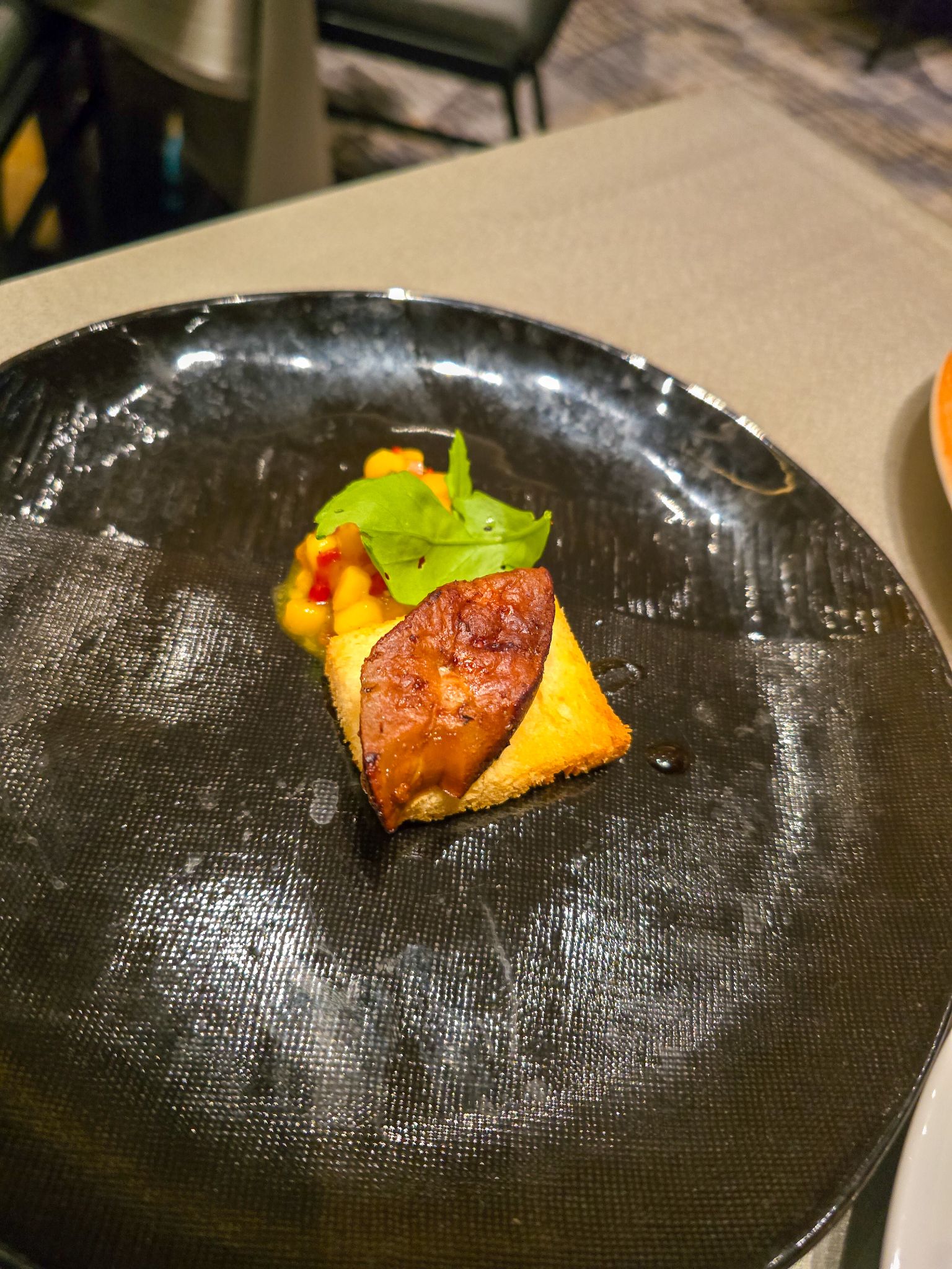 ​Seared Foie Gras: นี่คือจุดที่ต้องติแรงที่สุดครับ! ฟัวกราส์ย่างมาแห้งจนแทบจะไหม้และแข็งมาก ไม่เหลือความนิ่มความชุ่มฉ่ำของ Foie Gras เลยครับ แต่ก็พยายามกินจนหมด