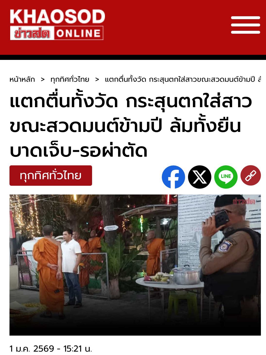 แตกตื่นทั้งวัด กระสุนตกใส่สาวขณะสวดมนต์ข้ามปี ทรุดล้มทั้งยืน ได้รับบาดเจ็บรอผ่าตัด สามีร่ำไห้เล่านาทีเกิดเหตุคิดว่าภรรยาเป็นลม วอนตำรวจล่าเจ้าของกระสุนปืนรายนี้