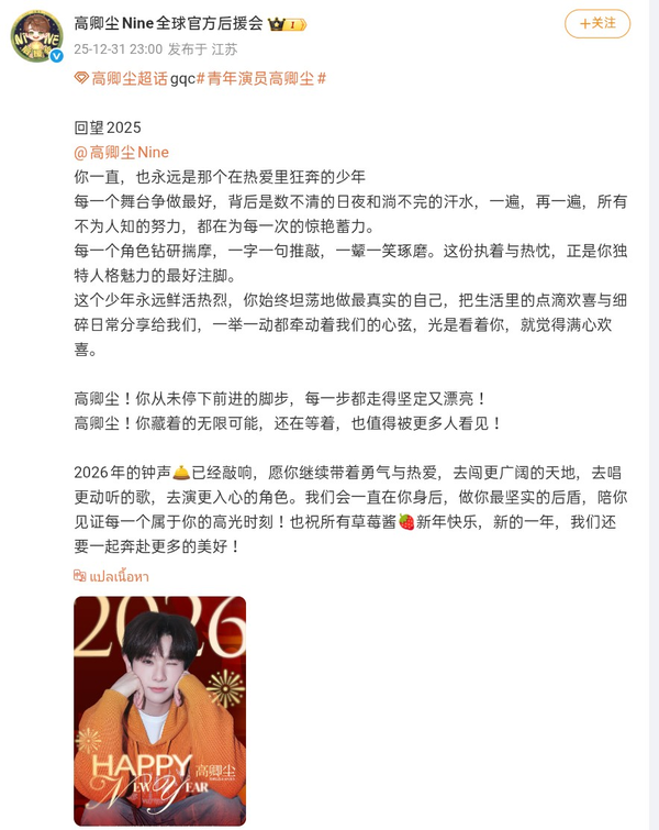 ภาพจากสโมสรแฟนคลับของ "น้องนาย" กรชิต บุญสถิต์ภักดี หรือ เกาชิงเฉิน เสียวจิ่ว (高卿尘 Nine) ศิลปินนักร้องนักแสดงจากประเทศไทยที่กำลังโด่งดังในจีน ในนามแยมสตรอเบอรี่ ได้โพสสวัสดีปีใหม่ พร้อมข้อความ ดังนี้ :