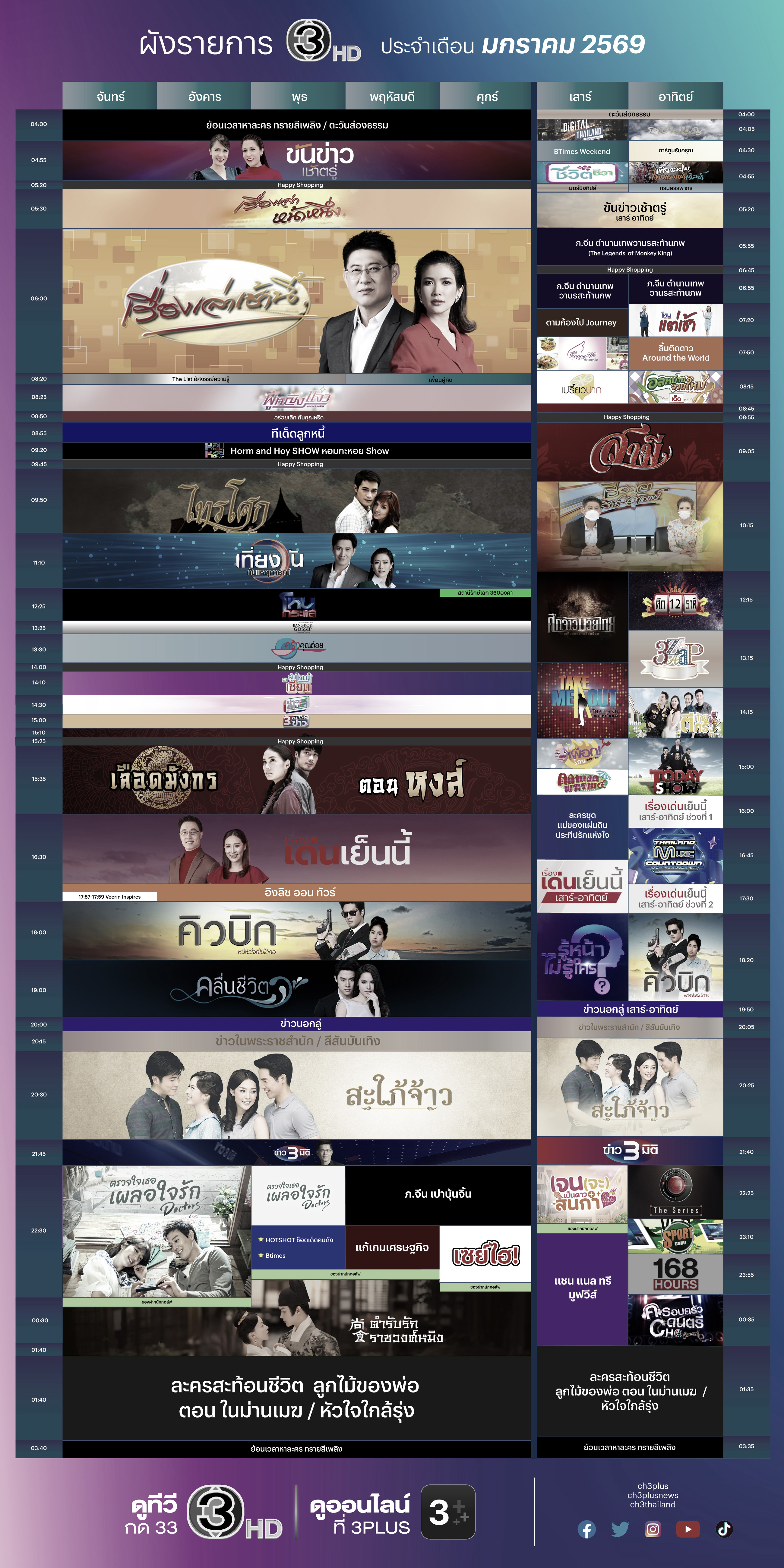 📌🔴 ผังรายการช่อง 3HD ประจำเดือน มกราคม 2569 📌🔴