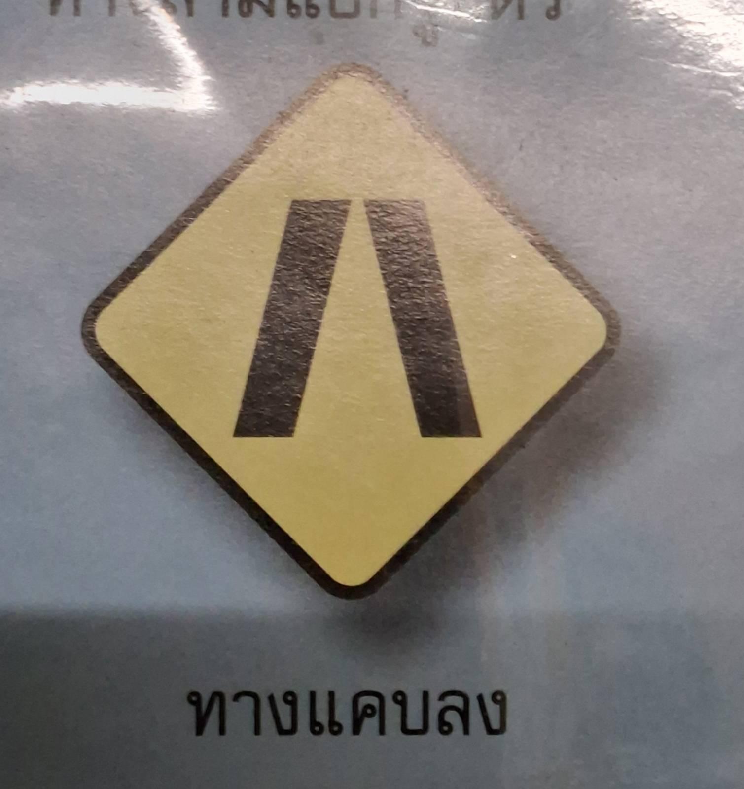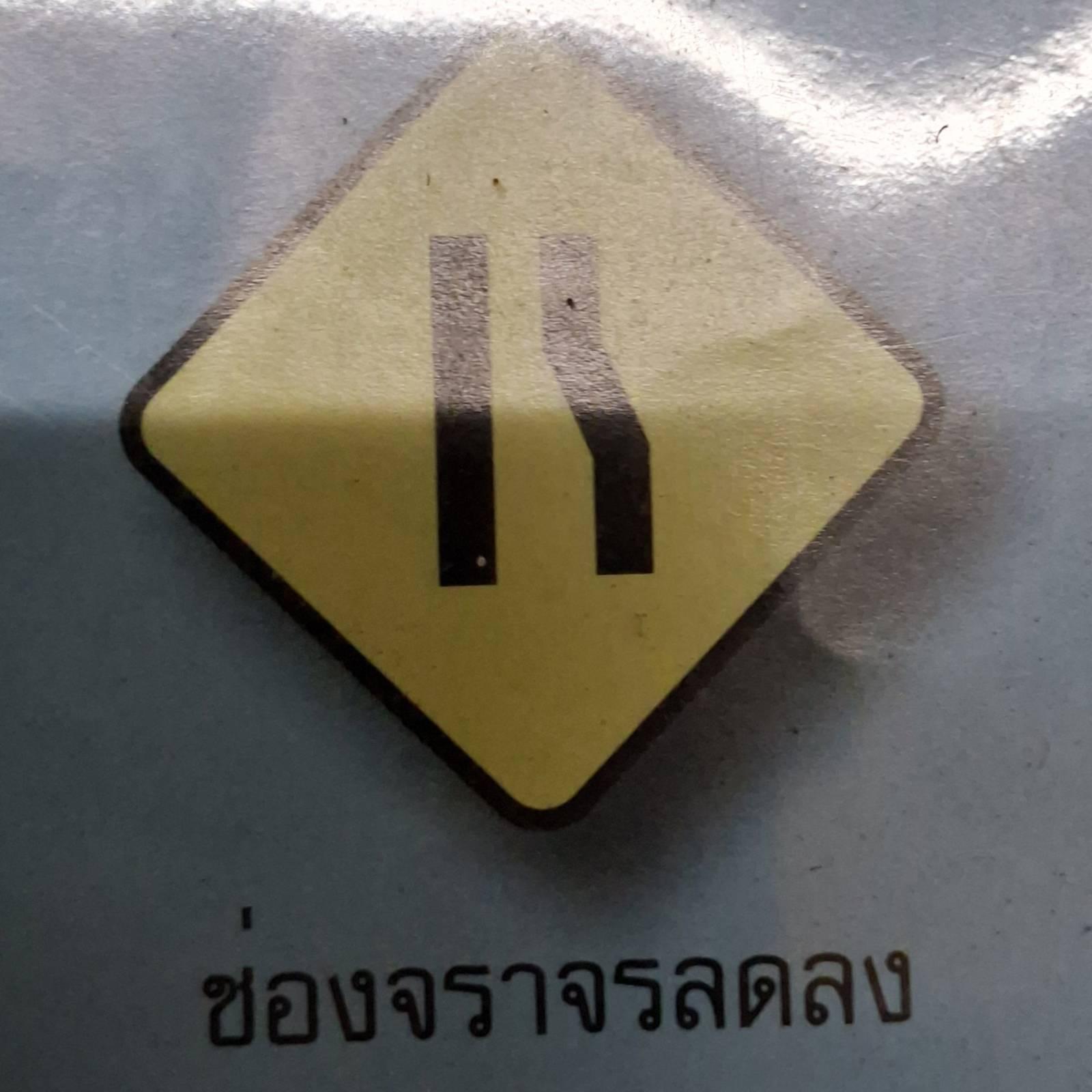 เคยเห็นตั้งแต่เด็กตอนอ่านหนังสือความรู้ แต่พอโตขึ้น อบรม กลับเจอแต่ป้าย "ช่องจราจรลดลง" ซึ่งเปลี่ยนชื่อมาสวมป้ายนี้แทน
