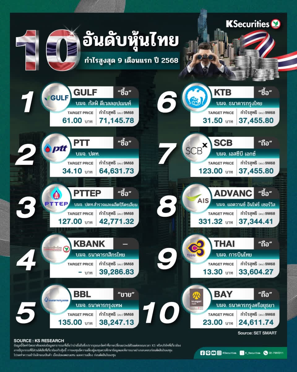 10 อันดับหุ้นไทย กำไรสูงสุด 9 เดือนแรก ปี 2568