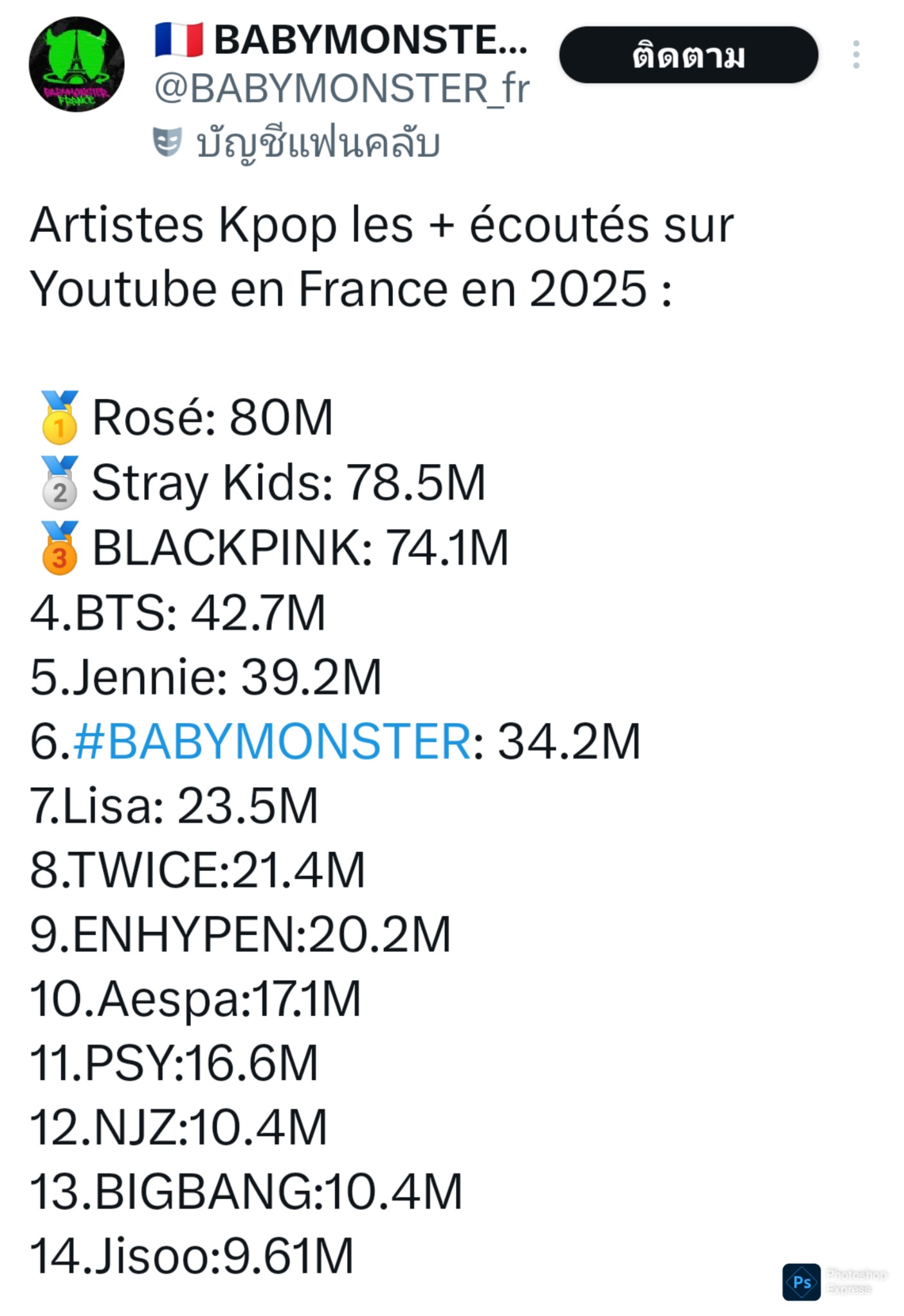 BABYMONSTER เป็นศิลปินเคป๊อปเกิร์ลกรุ๊ปเจน 4 และเจน 5 ที่มียอดผู้ฟังบน YouTube Music มากที่สุดในประเทศฝรั่งเศสในปี 2025