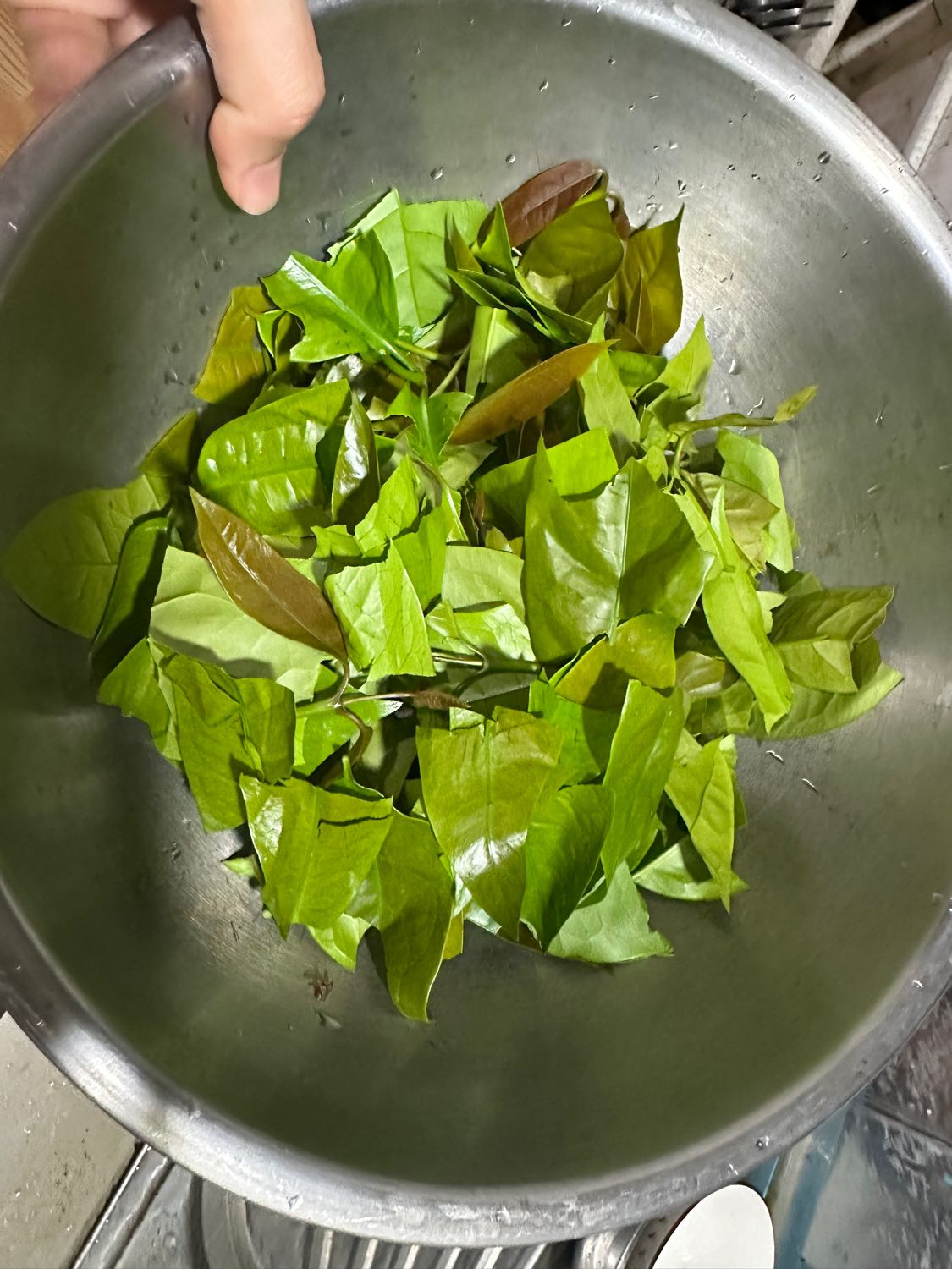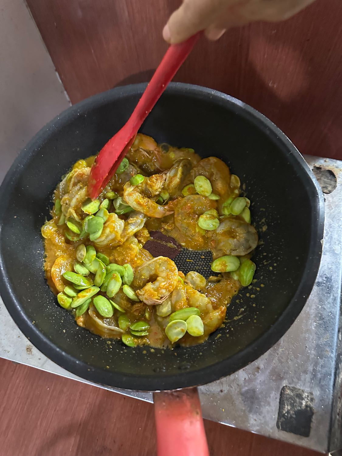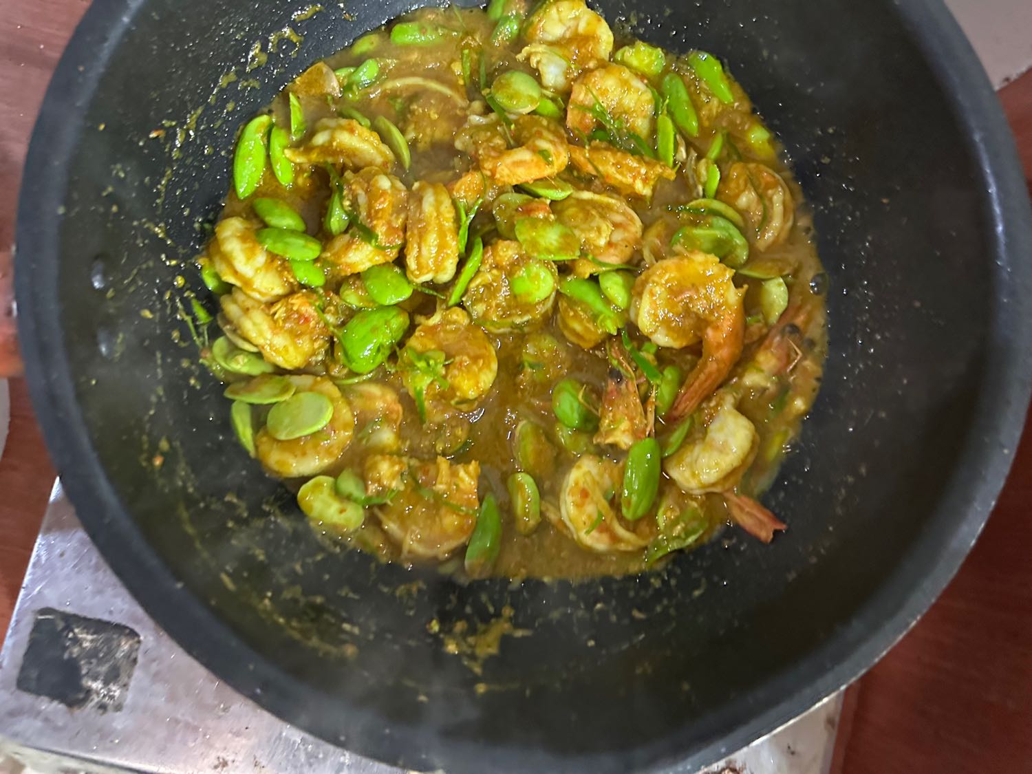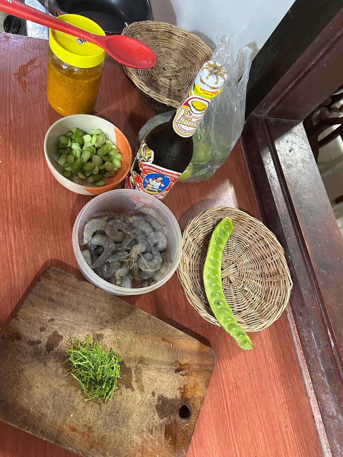 มื้อเช้า แบบคนใต้ค่ะ กุ้งผัดสะตอ ใบเหลียงผัดไข่ น้ำพริกกะปิ ปลาทูตัวสั้นทอด