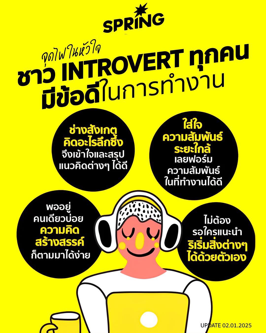 Introvert เป็นแค่สิ่งบ่งบอกว่า คนกลุ่มนี้ชาร์จพลังงานได้ดีเมื่ออยู่คนเดียว ไม่ใช่เครื่องตัดสินความสามารถหรือความน่าสนใจของบุคคล และจากลักษณะแบบนั้นนี่เอง ทำให้ชาว Introvert มีข้อดีบางอย่างที่พิเศษสุดๆ สามารถเป็นบุคลากรสุดเจ๋งในที่ทำงาน ที่เหล่าเพื่อนร่วมงานและนายจ้างทั้งหลายไม่ควรมองข้าม
