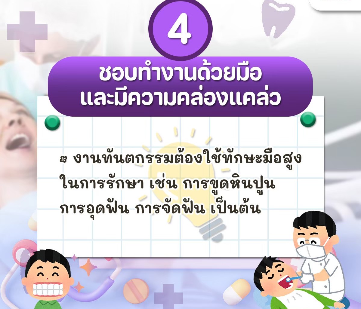 🔹 ความคล่องแคล่วทางหัตถการ: เป็นงานที่ต้องใช้ทักษะฝีมือเป็นหลัก เช่น การอุดฟันหรือจัดฟัน