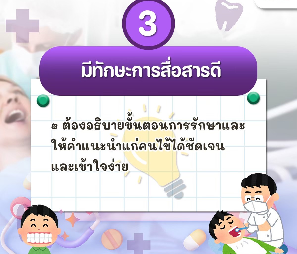 🔹 มนุษย์สัมพันธ์: สร้างความเชื่อมั่นและลดความกลัวการทำฟันให้คนไข้ทุกกลุ่ม