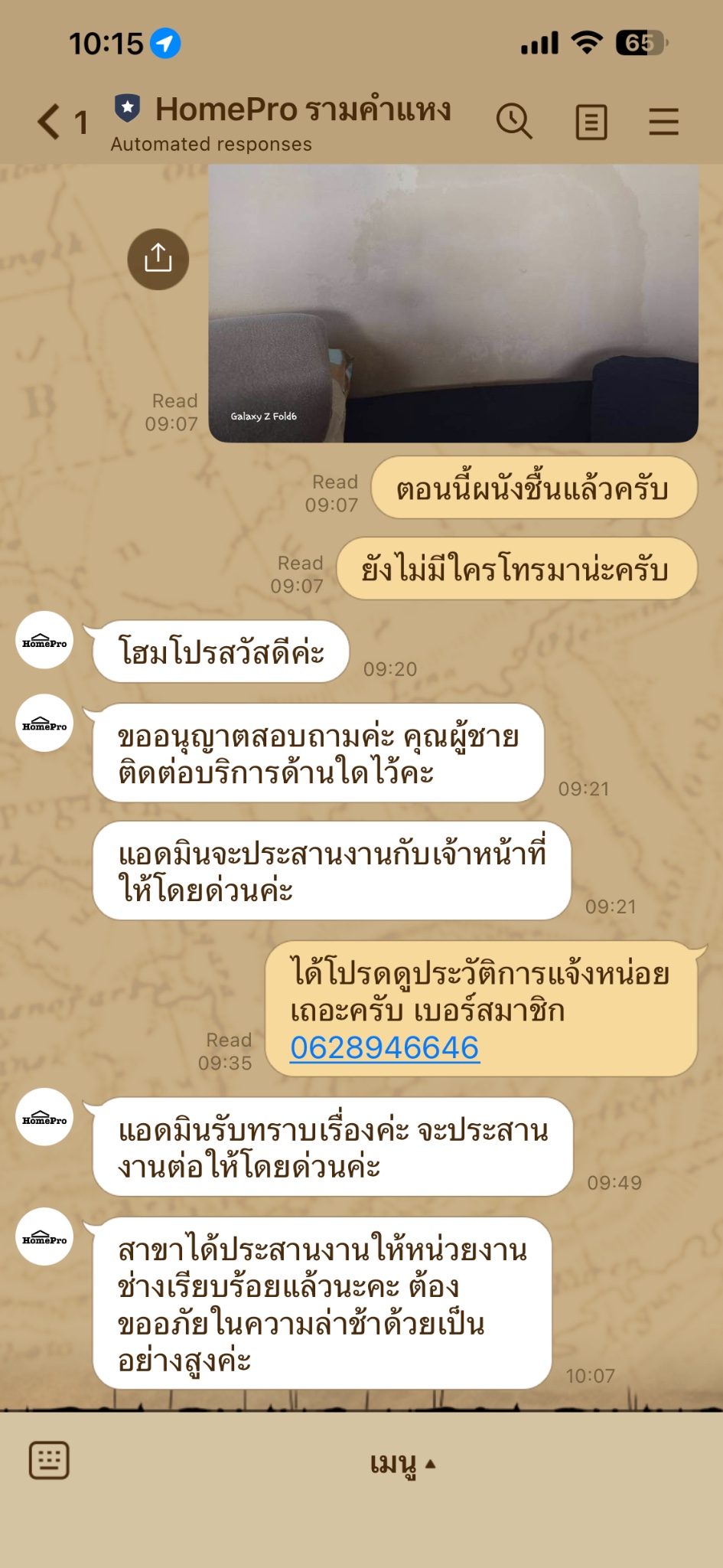 9. ทางผมติดต่อกับ Call center อีกครั้งช่วง 19.39 เพื่อแจ้งเหตุที่เกิดอีกครั้งและถามว่า ถึงตอนนี้ทางโฮมโปรยังไม่มีการติดต่อกลับมาเพื่อสอบถามความเสียหาย ทั้งผนัง ฝ้า  wallpaper และแจ้ง complain กับสาขารามคำแหง