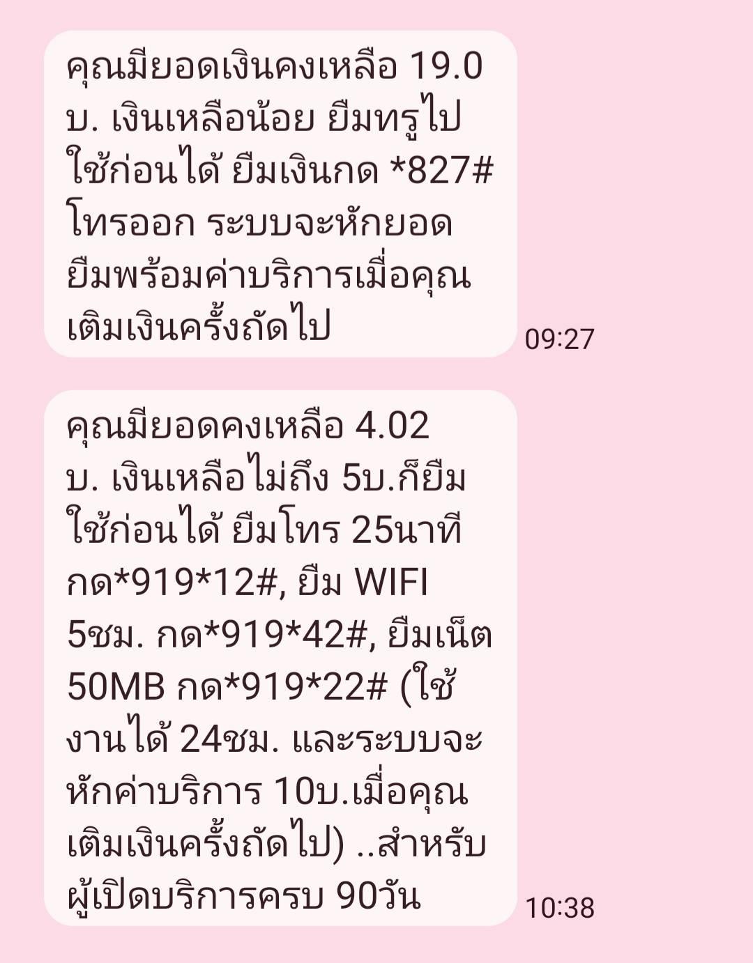 คือวันนี้เราได้รับกล่องข้อความว่า คุณมียอดยืมคงค้าง 57 บ. ระบบจะหักยอดยืมคงค้างคืน เมื่อคุณเติมเงินครั้งถัดไป อยู่ ๆ ก็เด้งขึ้นมาแบบไม่มีปี่มีขลุ่ย เรายังไม่ได้กดโทรยืมด้วยซ้ำ ปกติถ้ากดโทรมันจะขึ้นว่า