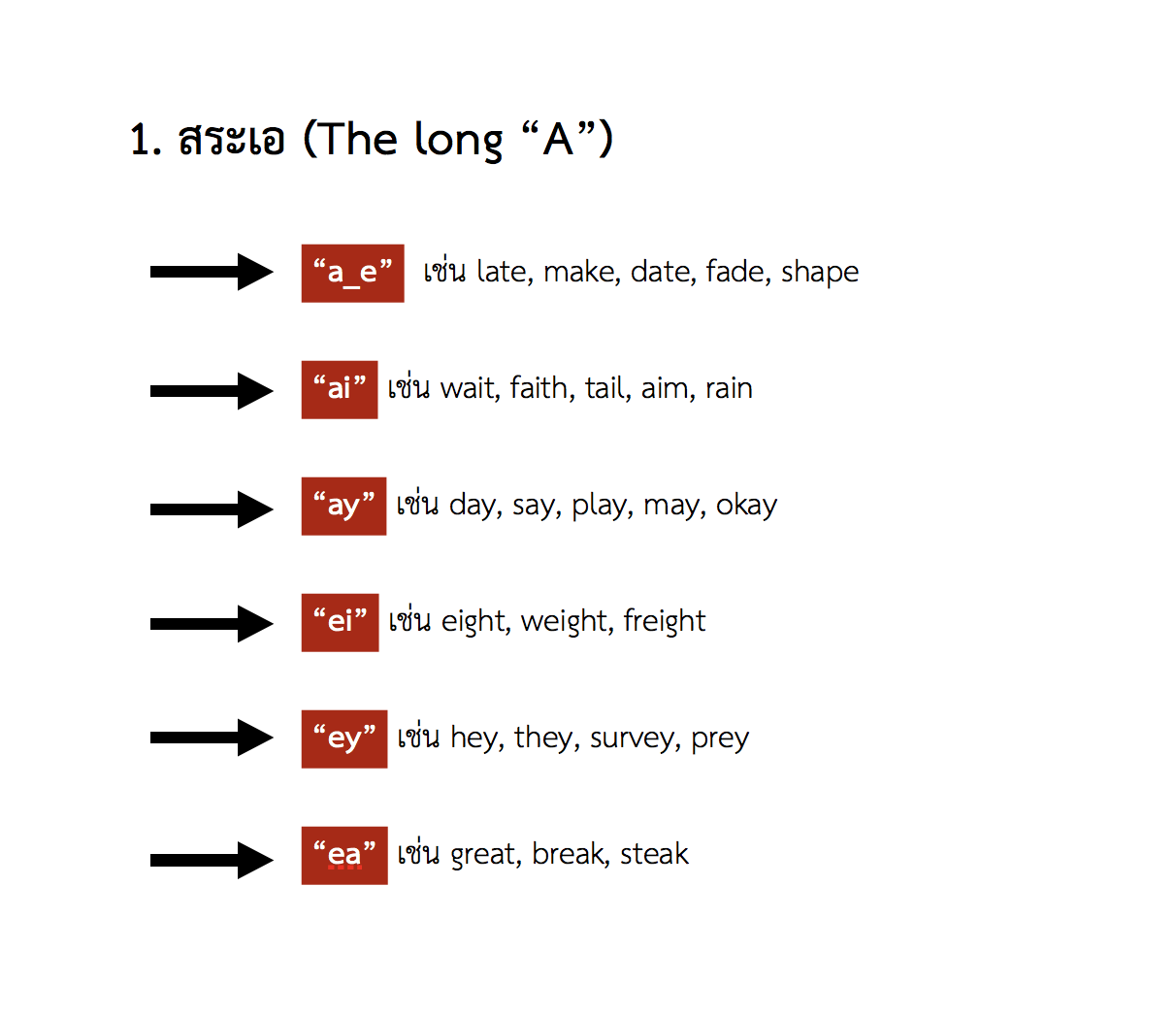สระตัวที่หนึ่งคือ “A เสียงยาว” ซึ่งโดยส่วนมากจะสะกดได้ 6 แบบ