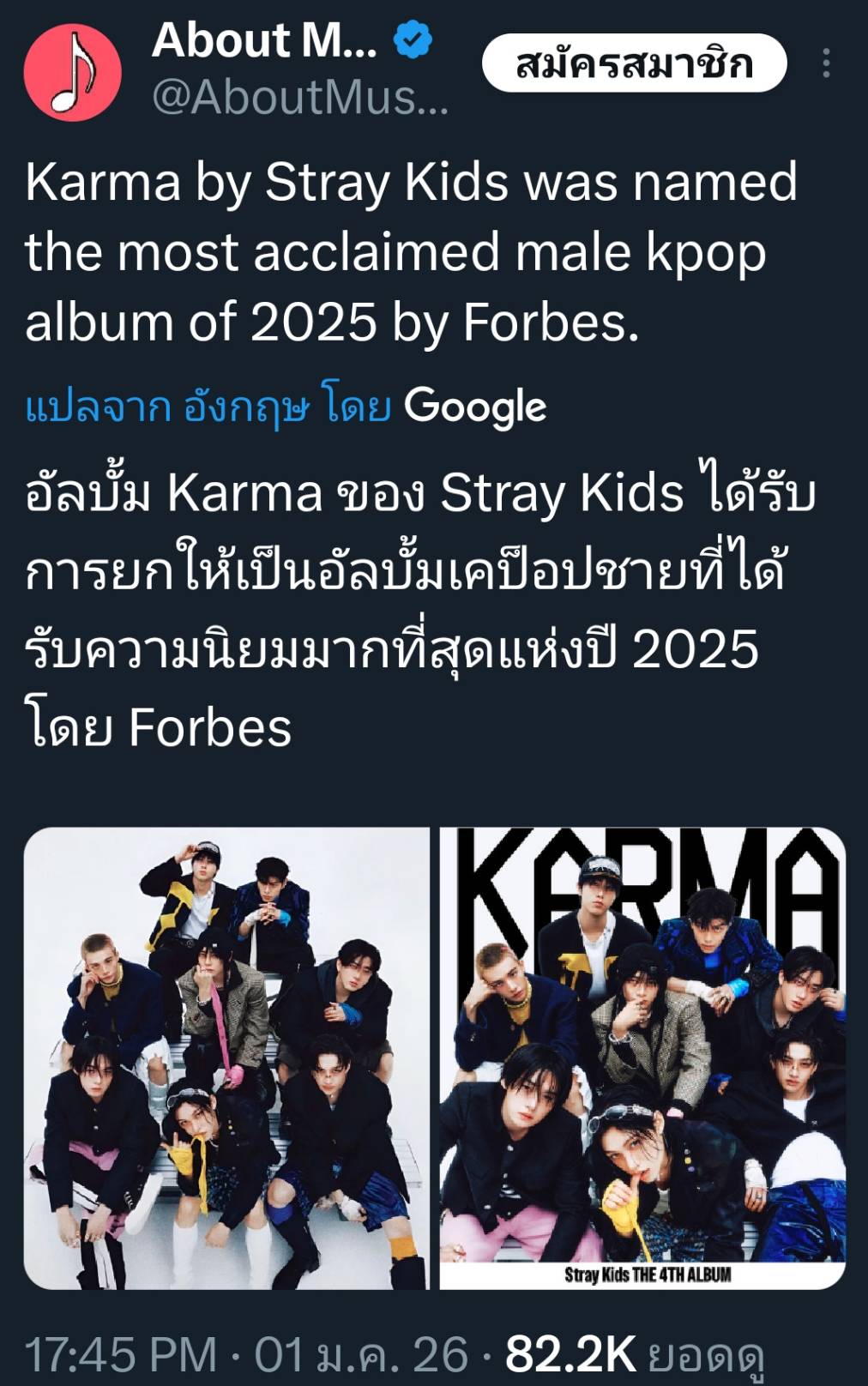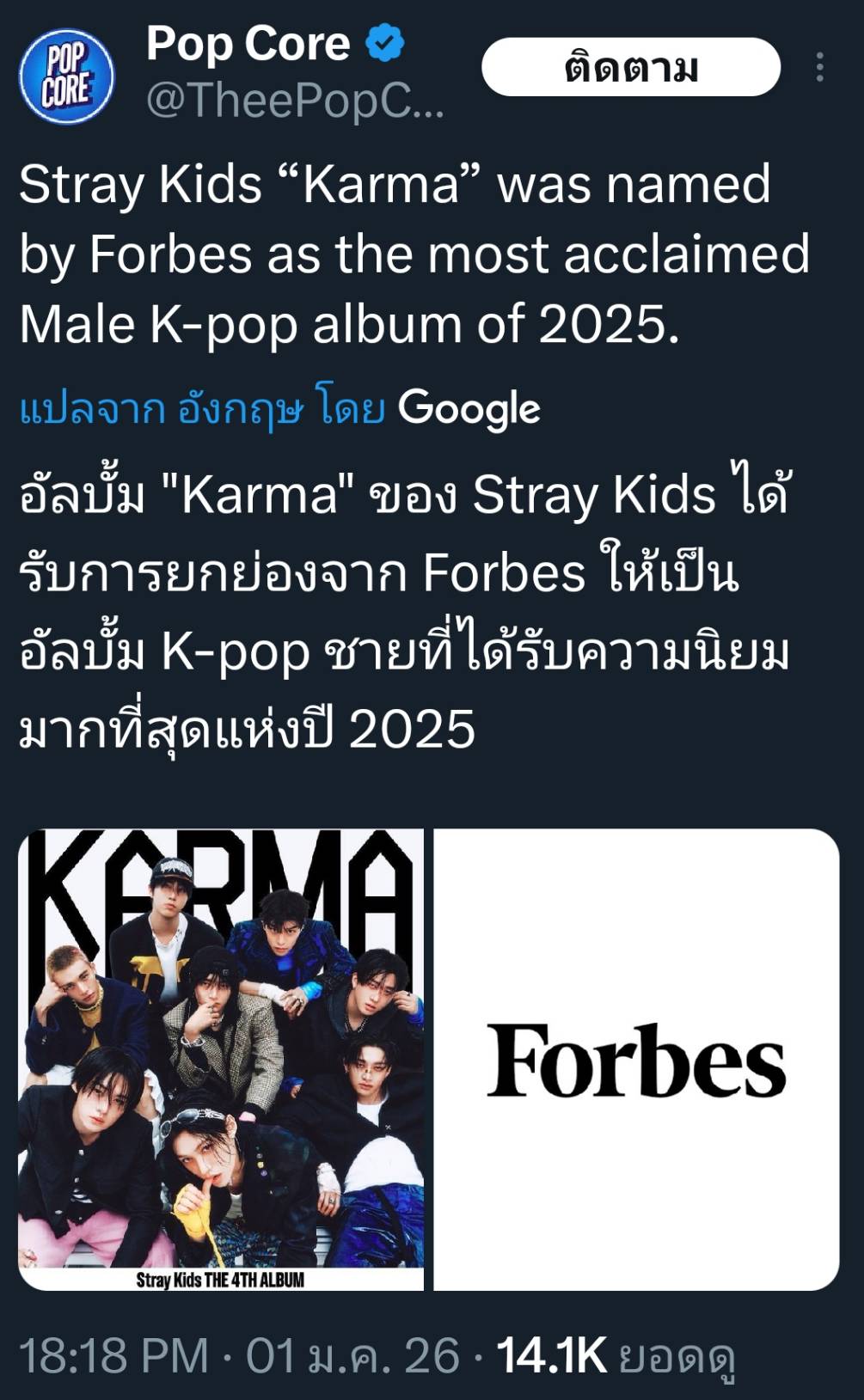 🔥 Stray Kids สื่อดังของสหรัฐอเมริกา Forbes ยกให้ "KARMA" เป็นอัลบั้ม k-Pop ชายที่ได้รับความนิยมมากที่สุดแห่งปี 2025