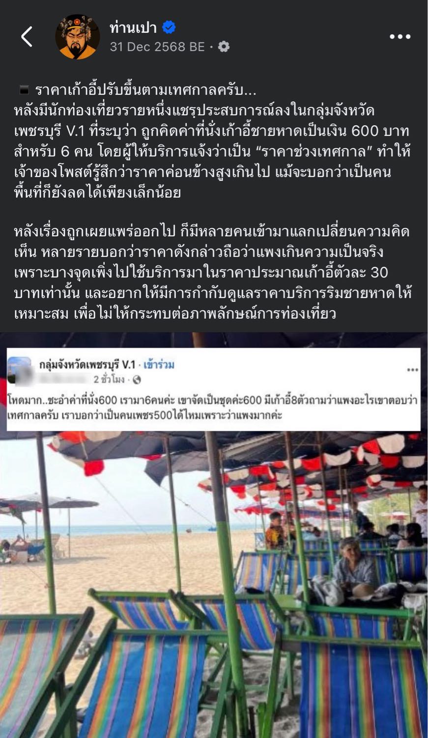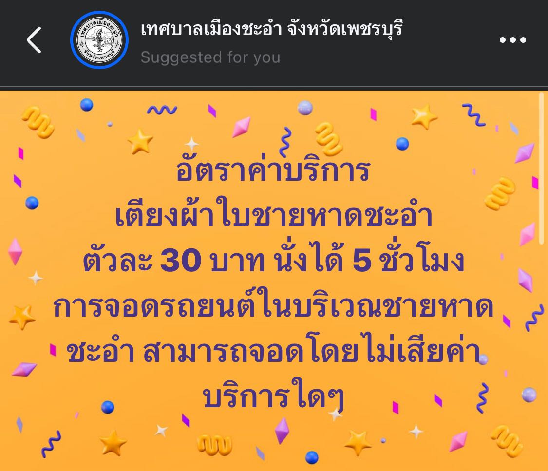 เทศบาลเมืองชะอำ โพสต์ชี้แจงค่าบริการเก้าอี้ ชายหาดแล้ว