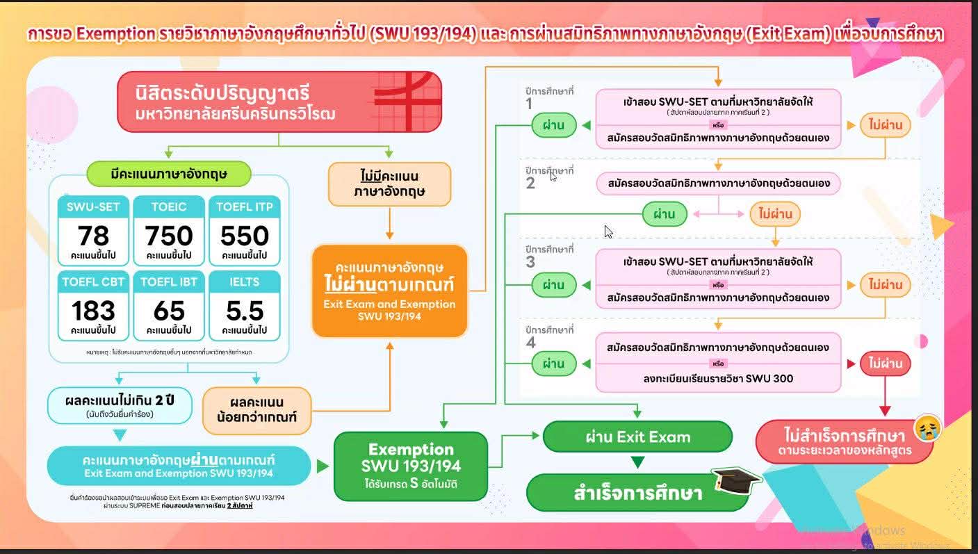 คือผมถอนรายวิชา SWU193 SWU194 ไปเกรดตอนนี้เป็น W อยู่ และอิงตามจากรูปนี้ผมไม่มีคะแนนภาษาอังกฤษใดๆเลยที่จะสามารถ Exemption และ Exit Exam ไปได้ รวมถึงตัดการสมัครสอบวัดสมิทธิภาพทางภาษาอังกฤษด้วยตนเองไปได้เลย และผมสามารถเรียนSWU300 ให้เป็นเกรดS เพื่อสามารถผ่าน Exit Exam ได้ แต่ที่ผมสงสัยคือ