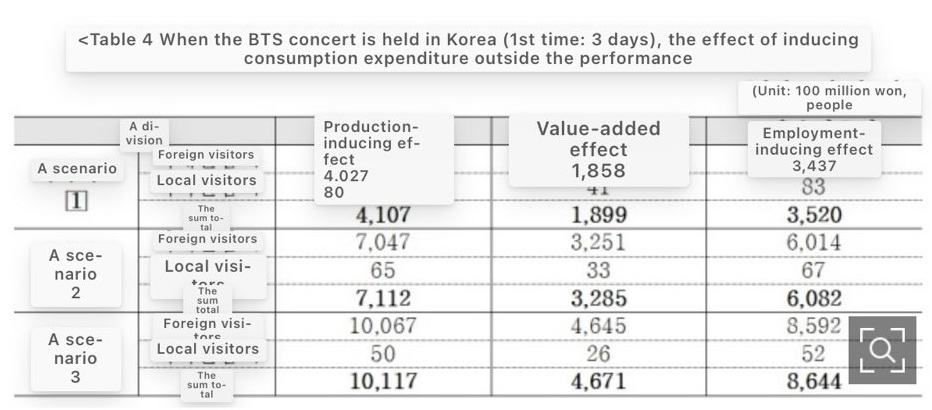 สถาบันวัฒนธรรมและการท่องเที่ยวแห่งเกาหลีประเมินว่าผลกระทบทางเศรษฐกิจจากการจัดคอนเสิร์ตในประเทศของ BTS มีมูลค่าสูงถึง 1.2 ล้านล้านวอนต่อคอนเสิร์ต และหากจัดคอนเสิร์ตปีละ 10 ครั้ง มูลค่าอาจสูงถึง 12 ล้านล้านวอน ตัวเลขเหล่านี้บ่งชี้ว่าคอนเสิร์ตไม่ใช่แค่ "การขายตั๋ว" แต่เป็นกิจกรรมระดับเมืองที่รวมเอาเวลาที่ใช้ในภูมิภาค การเดินทาง และการบริโภคเข้าไว้ด้วยกัน