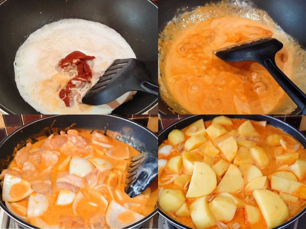 1. ตั้งไฟอ่อนใส่กะทิครึ่งนึง ลงไปผัดกับ น้ำพริกแกงมัสมั่น จนแตกมัน