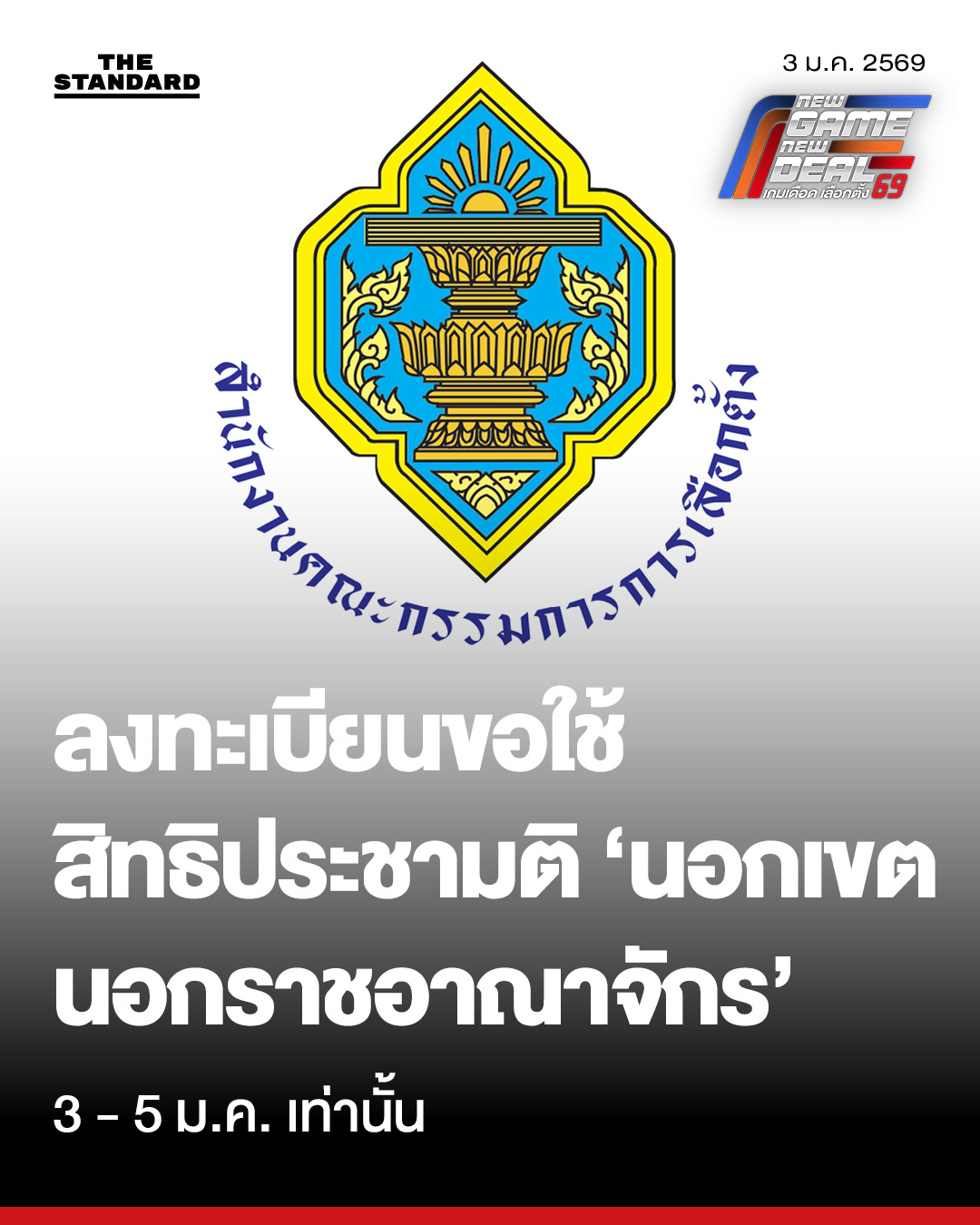 กกต. เปิดลงทะเบียนขอใช้สิทธิ ‘นอกเขต-นอกราชอาณาจักร’ วันนี้ - 5 ม.ค. เท่านั้น 8 ก.พ. 69 เข้าคูหาพร้อมกัน