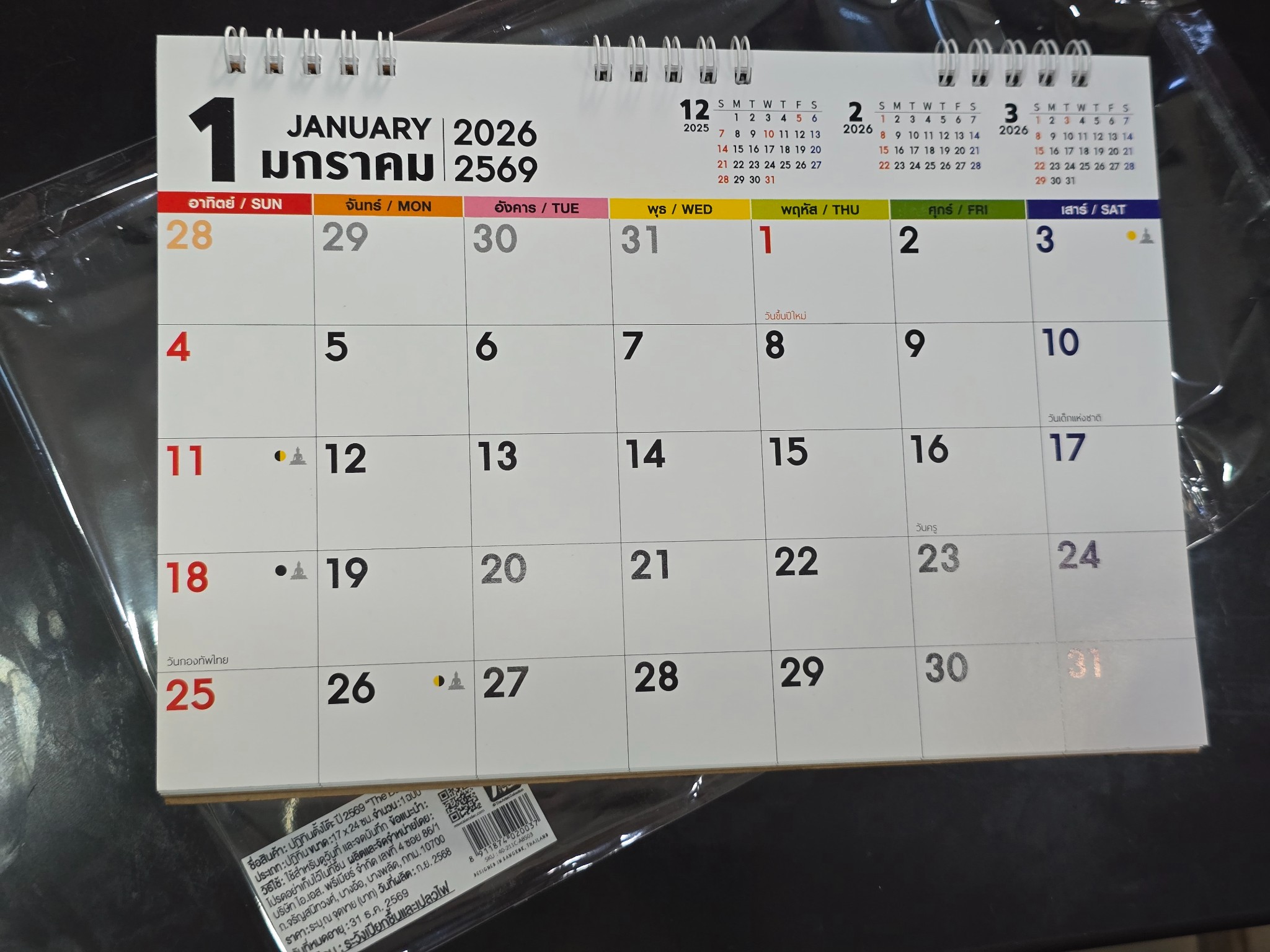 ขนาดใหญ่กว่าเดิมไป 1 ช่องวัน... แต่ได้ตัวเลขและพื้นที่เขียนใหญ่จุใจ... มีแสดงทั้งวันหยุดตัวแดง และวันพิเศษต่างๆที่ไม่ได้หยุดด้วย...