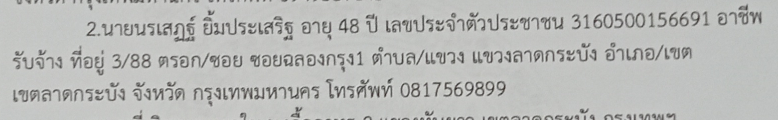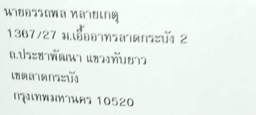 4. ห้อง1367/10 ห้อง10 ชั้น2 ตึก98 เฟส2 หมู่บ้านเอื้ออาทรลาดกระบัง2 เฟส2 ซอยวัดพลมาณีย์ ถนนประชาพัฒนา แขวงทับยาว เขตลาดกระบัง กรุงเทพมหานคร 10520(คนที่ตึก98เขาเรียกกันชื่อเล่น ไอ้ชาติ)