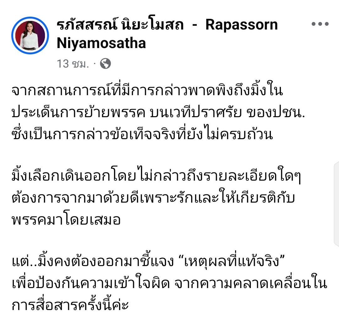 🔊 อดีต ส.ส. “มิ้ง รภัสสรณ์” ขอชี้แจง "เหตุผลที่แท้จริง" หลังถูกกล่าวพาดพิงเรื่องการย้ายพรรค บนเวทีปราศรัยของ ปชน.