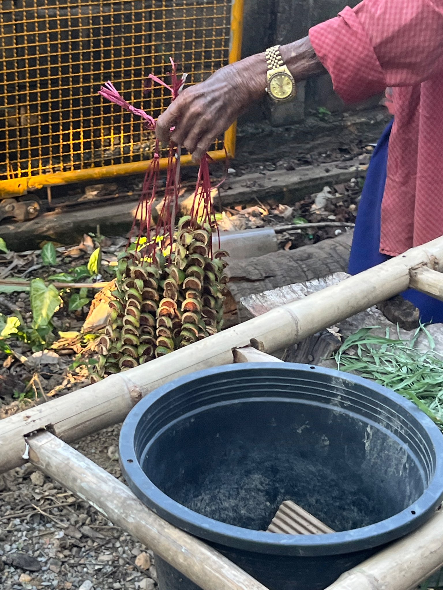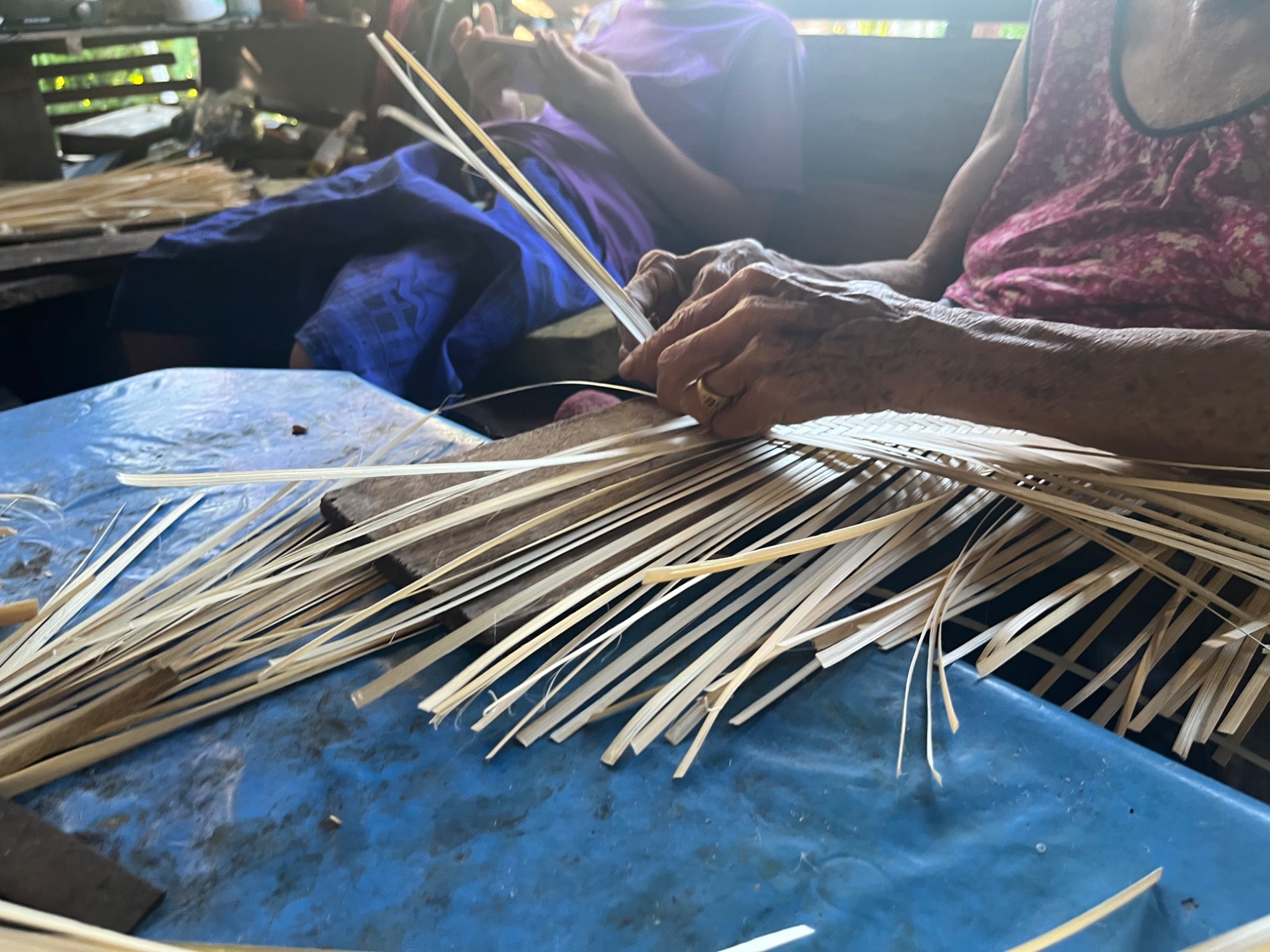 วันนี้โชคดีที่เจอแม่หลวงพรกับหลานนั่งสานแอ๊ปข้าวกันสองคนที่ชานม้านั่งหน้าบ้าน