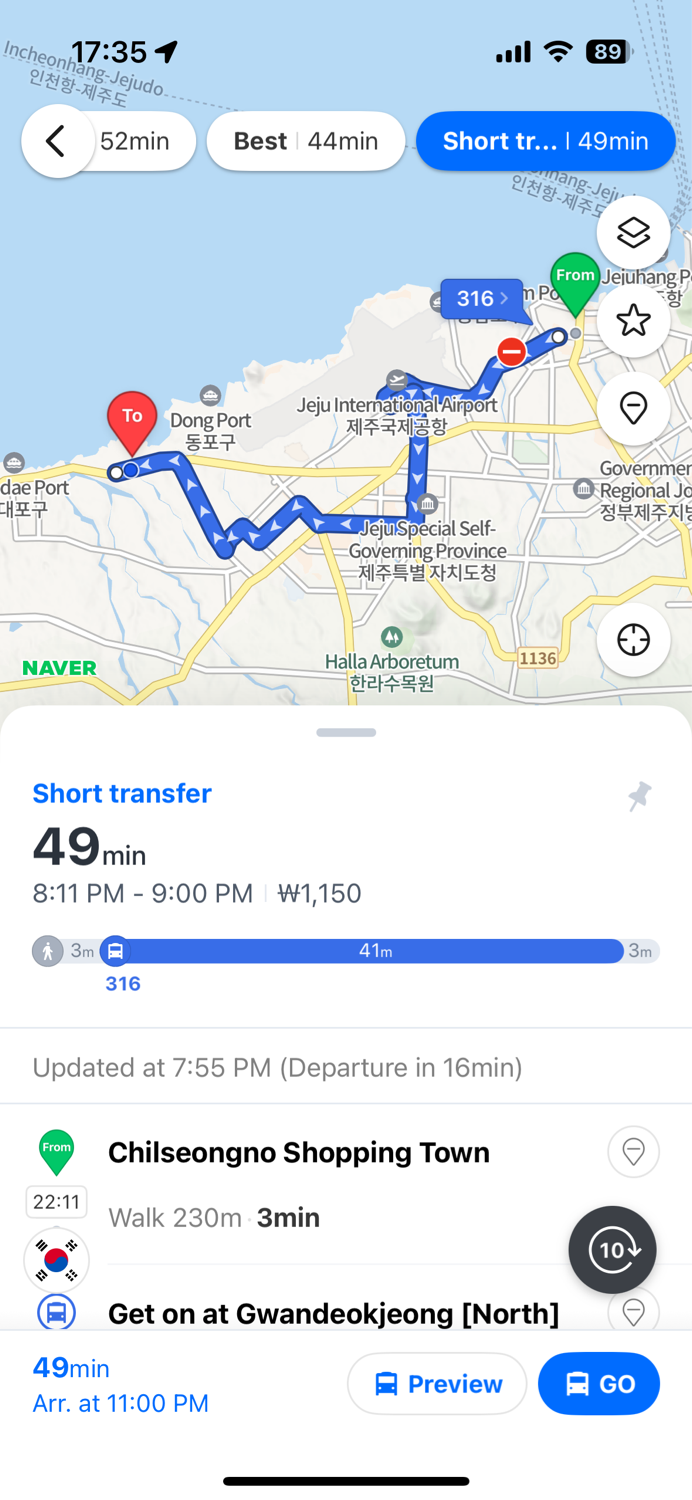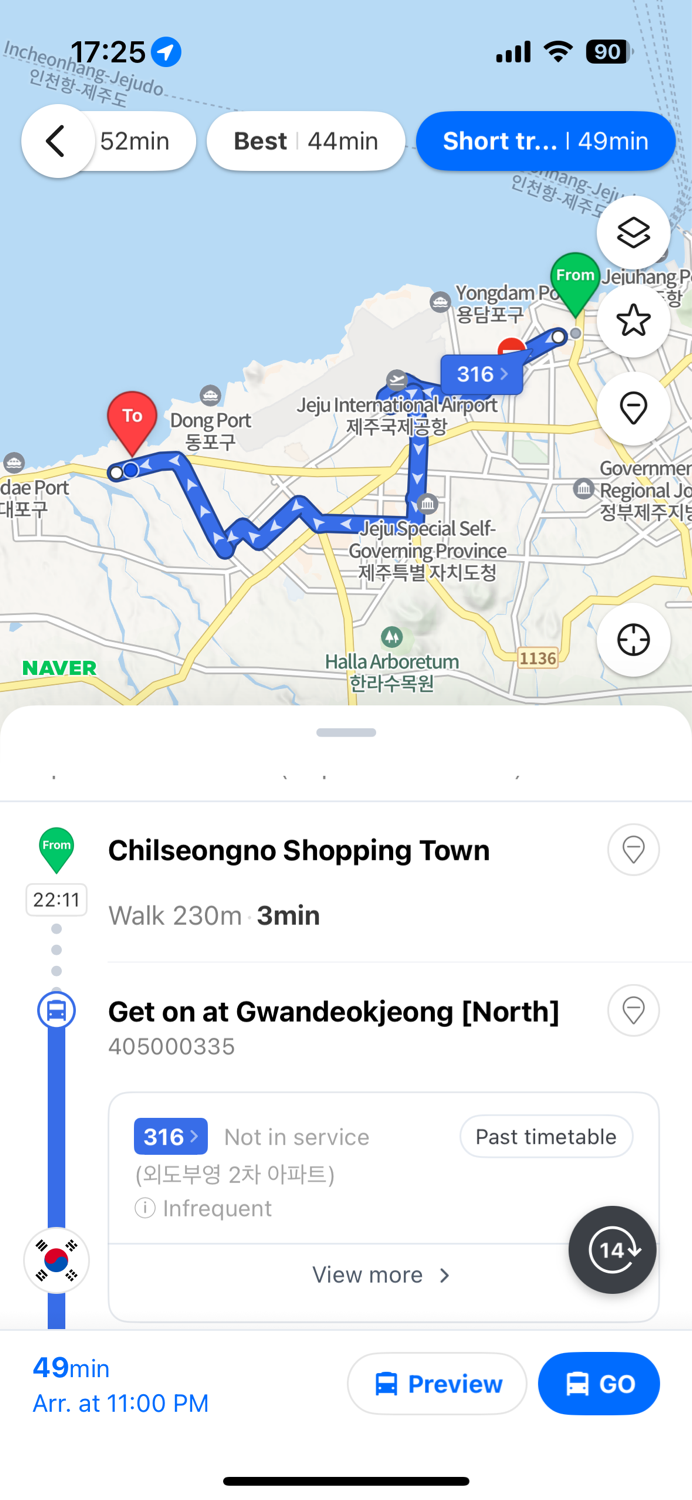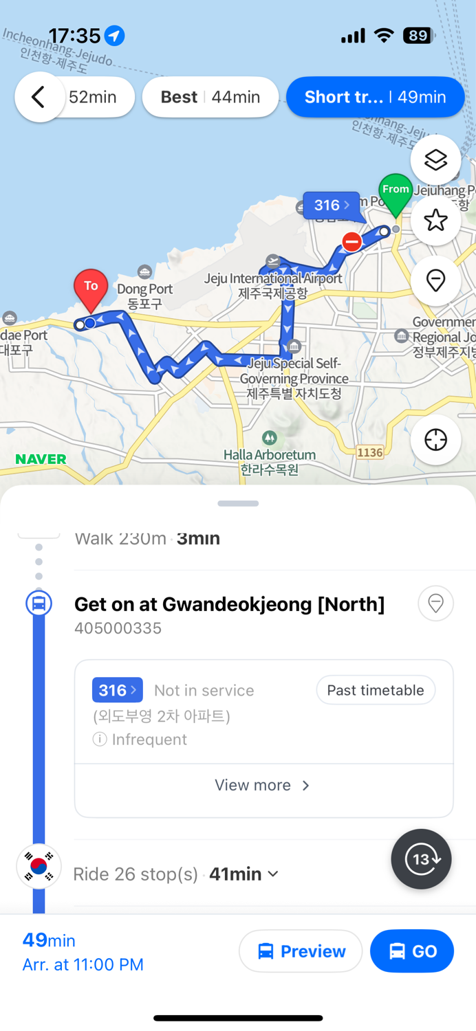 แล้วทัวร์ให้อิสระ 1 วัน เรากะจะกลับโรงแรมก่อน 2 ทุ่ม พอเราดูใน Naver map มันบอก รถเมล์นี้ 316 not in service ตามภาพที่แนบมา เลยอยากทราบว่า ณ วันที่ 8 มันไม่ให้บริการหรอคะ ?
