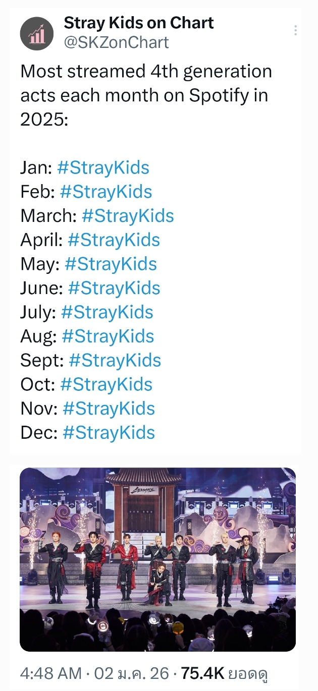 🔥 Stray Kids อันดับ1 เจน4 วงเดียว! กวาดเรียบยอดสตรีมอันดับ1 ทั้ง 12 เดือนบน Spotify ด้วยยอดทะลุ 3.68 พันล้านในปี 2025