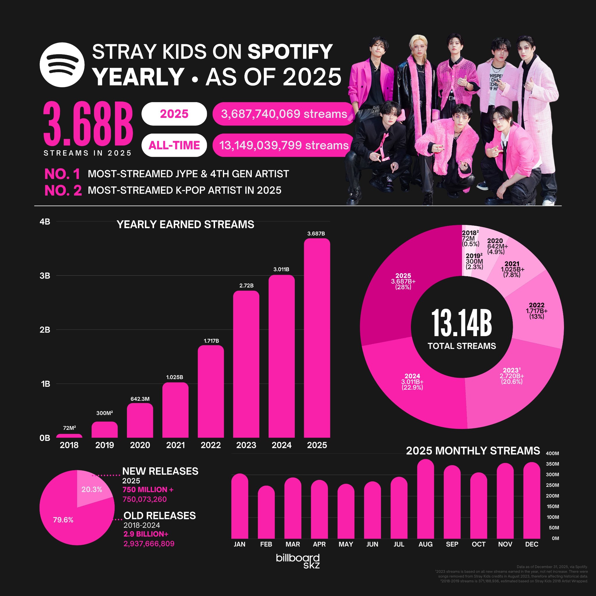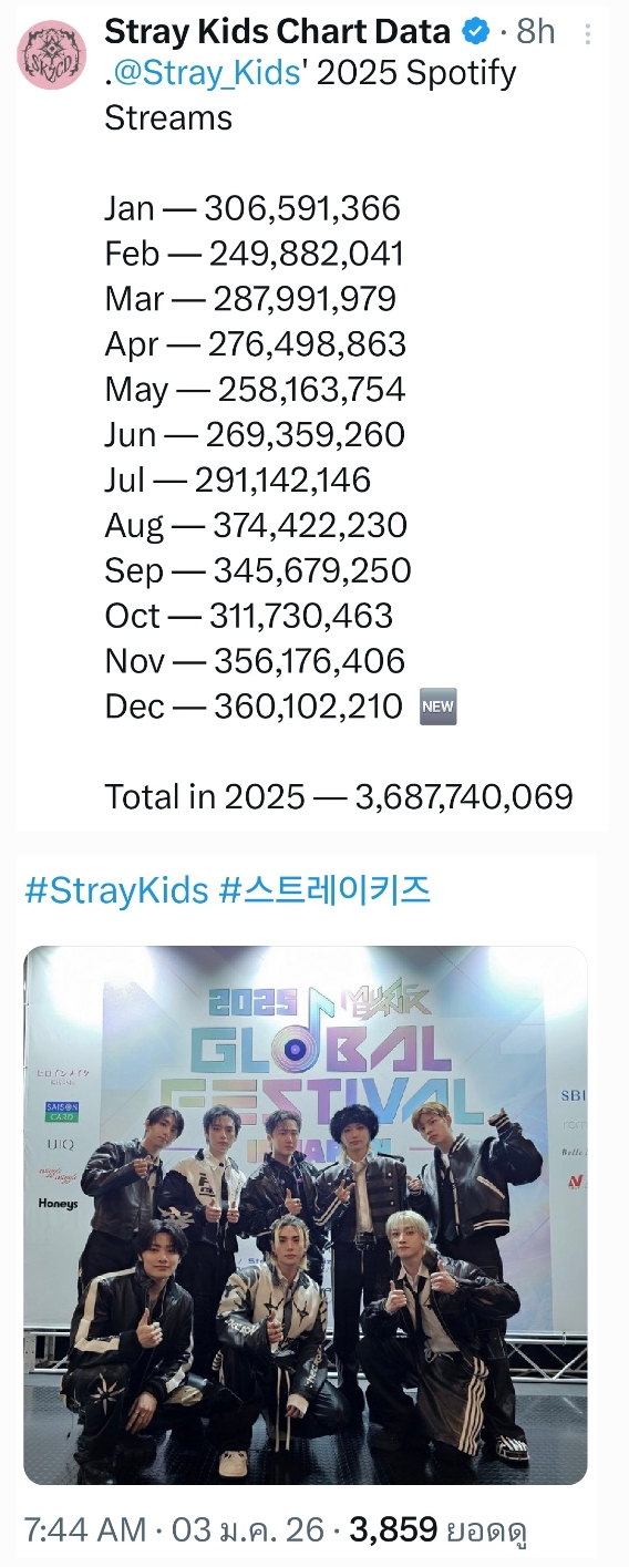 SKZ ยอดสตรีมรายเดือน รวมแล้วทะลุ 3.68 พันล้านปี2025