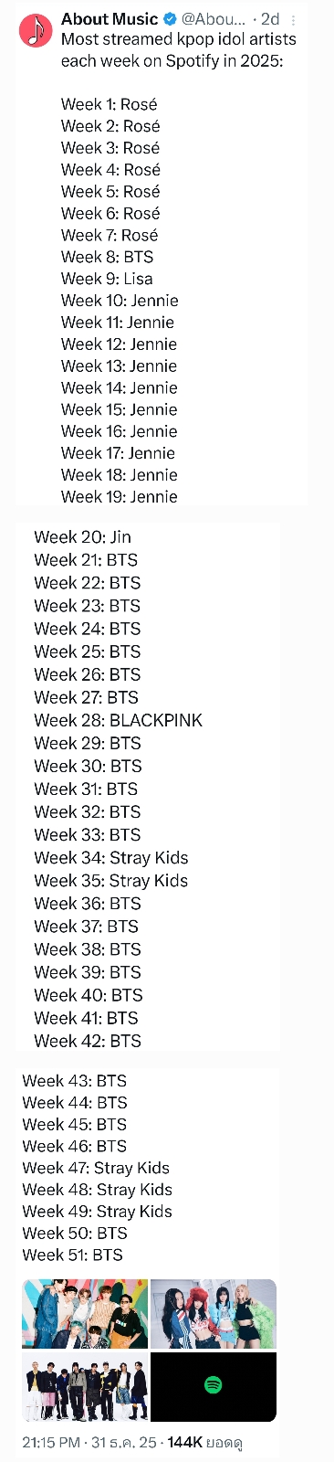 นอกจากนี้ ในปี2025 SKZ ยังมี Week ที่ขึ้นอันดับ1 ของ K-Pop
