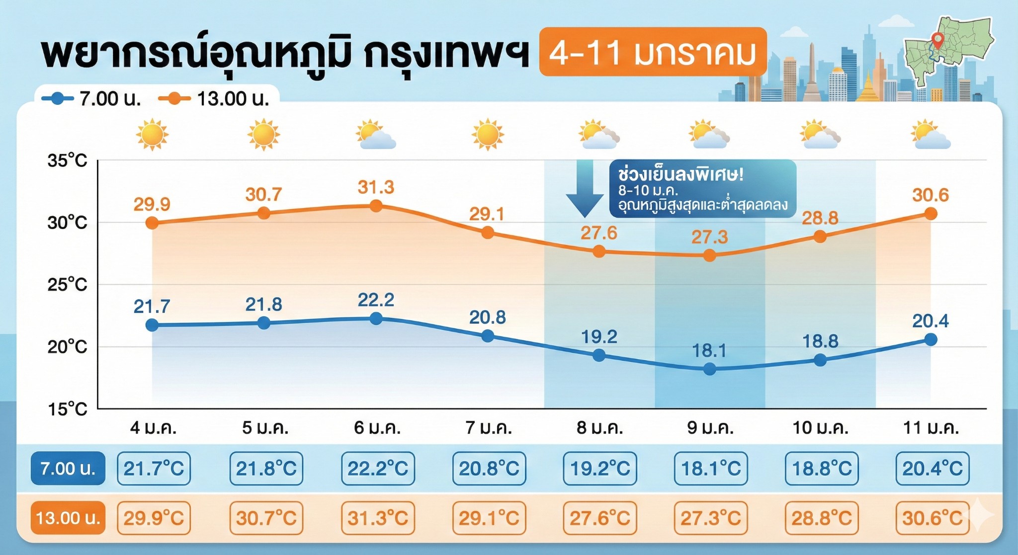พยากรณ์ กทม. 4-11 ม.ค. เช็คลิสต์วันไหน "หนาวจริง" หรือ "หนาวหลอก(ตอนบ่ายร้อน)"