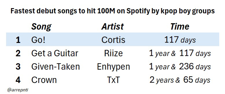 เพลง Go! ของ Cortis มียอดสตรีมทะลุ 100 ล้านครั้งบน Spotify แล้ว! นับเป็นเพลงเปิดตัวของบอยแบนด์เคป็อปที่ทำยอดสตรีมได้ถึง 100 ล้านครั้งเร็วที่สุด ภายในระยะเวลา 117 วัน !!