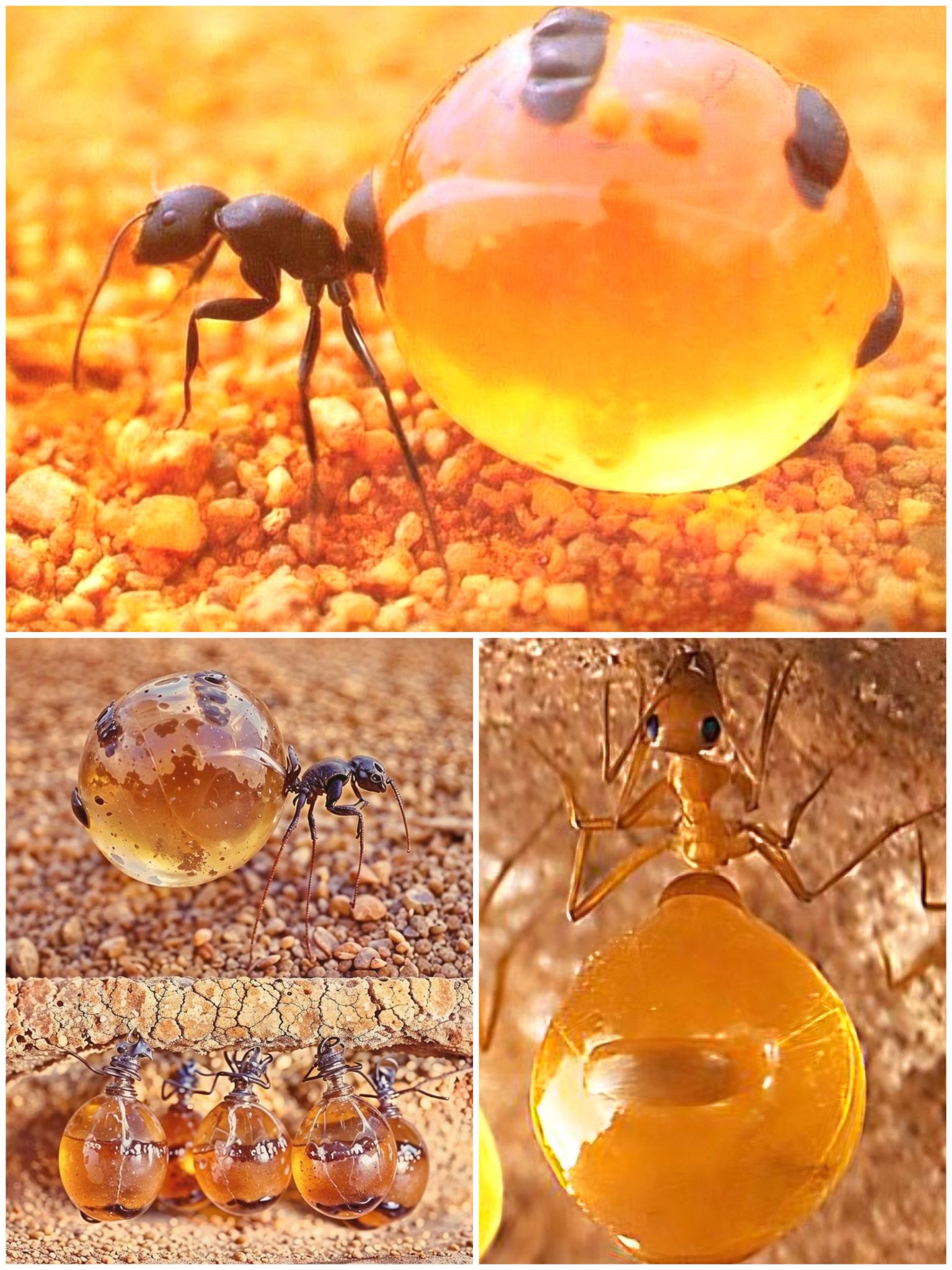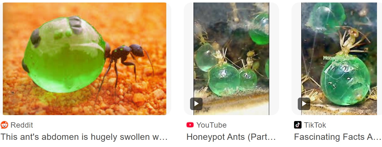 มดน้ำผึ้ง "ตู้เสบียงมีชีวิต" มดงานชนิดพิเศษที่ทำหน้าที่เก็บน้ำหวานหรืออาหารเหลวไว้ในช่องท้อง ที่ขยายใหญ่10เท่าจนกลมใส