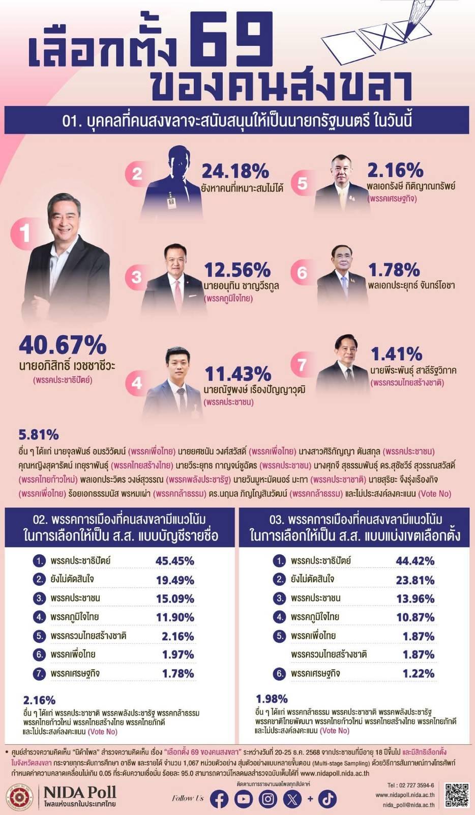 นิด้าโพล สำรวจเลือกตั้ง 69 คนสงขลา จะเลือกพรรคใด ปรากฏว่า....