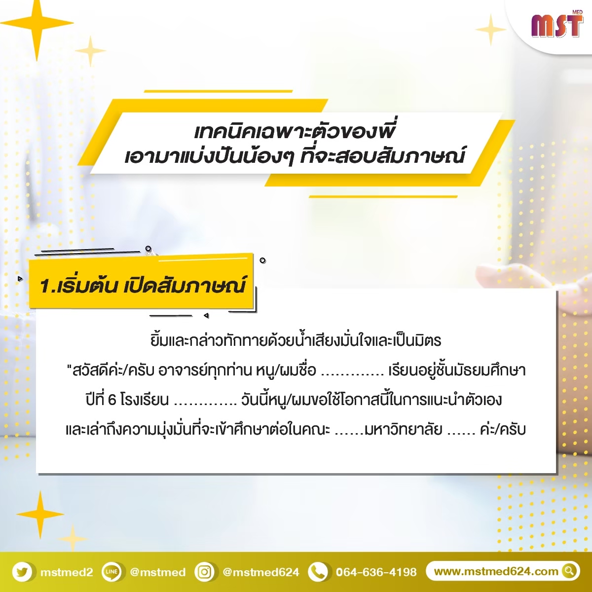 1. เริ่มต้นเปิดการสัมภาษณ์ ยิ้มแย้ม ทักทายด้วยความมั่นใจ บอกชื่อ-นามสกุล โรงงาน และแสดงความมุ่งมั่นทันที!
