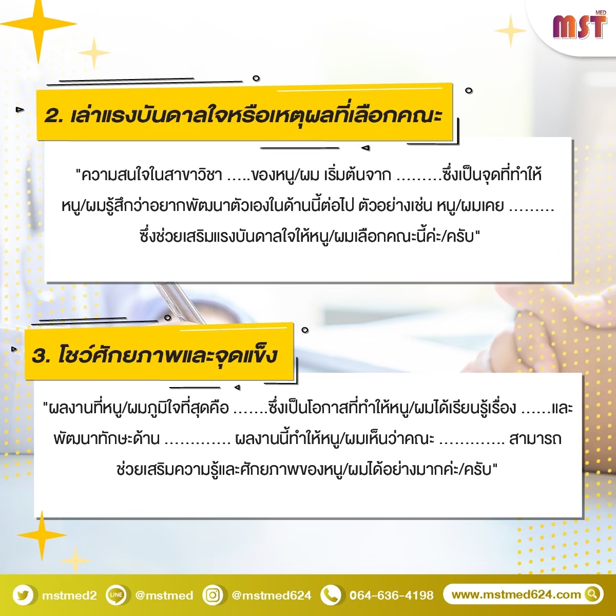 2. เล่าแรงบันดาลใจ/เหตุผลที่เลือกคณะ บอกเล่าจุดเริ่มต้นที่ทำให้เราหลงรักในสาขาวิชานี้ เพื่อแสดงความเป็นตัวจริง