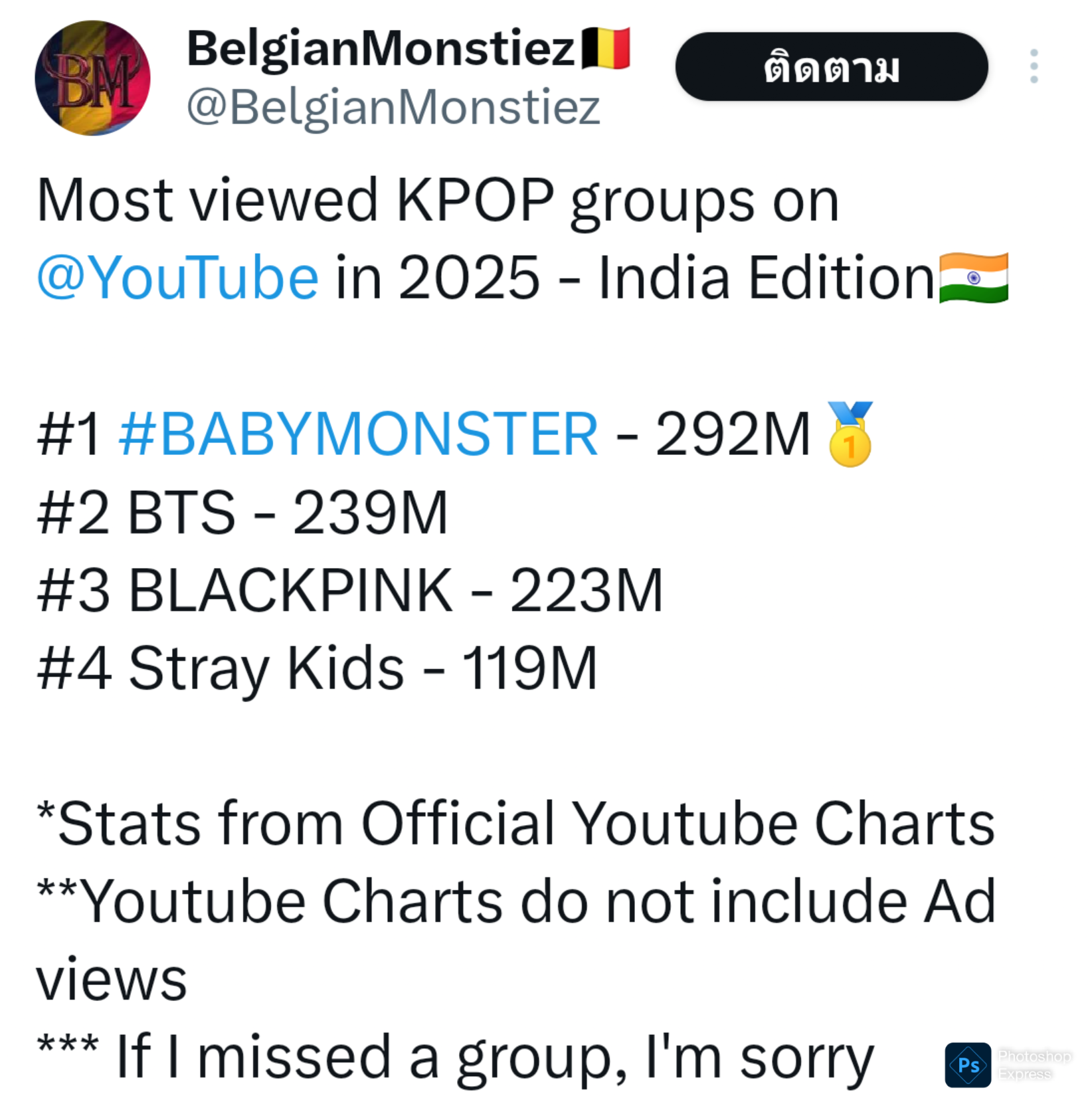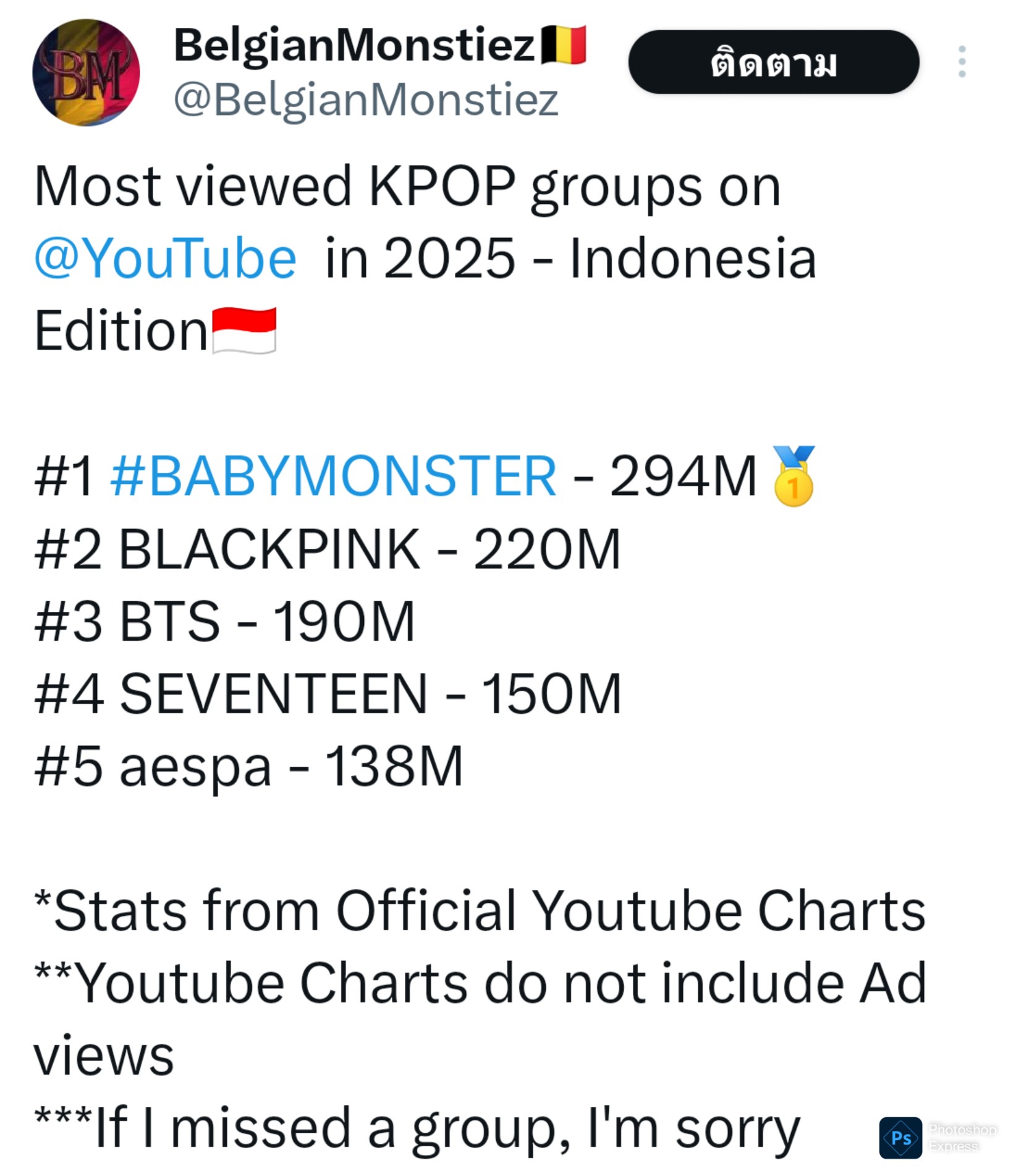 ข่าวเสริม : เปิดเผยรายชื่อ 15 ประเทศที่มีการชมคลิปบน YouTube ของ BABYMONSTER มียอดวิวสูงสุดในปี 2025 ซึ่งมียอดวิวจากแฟนๆทั่วโลก
